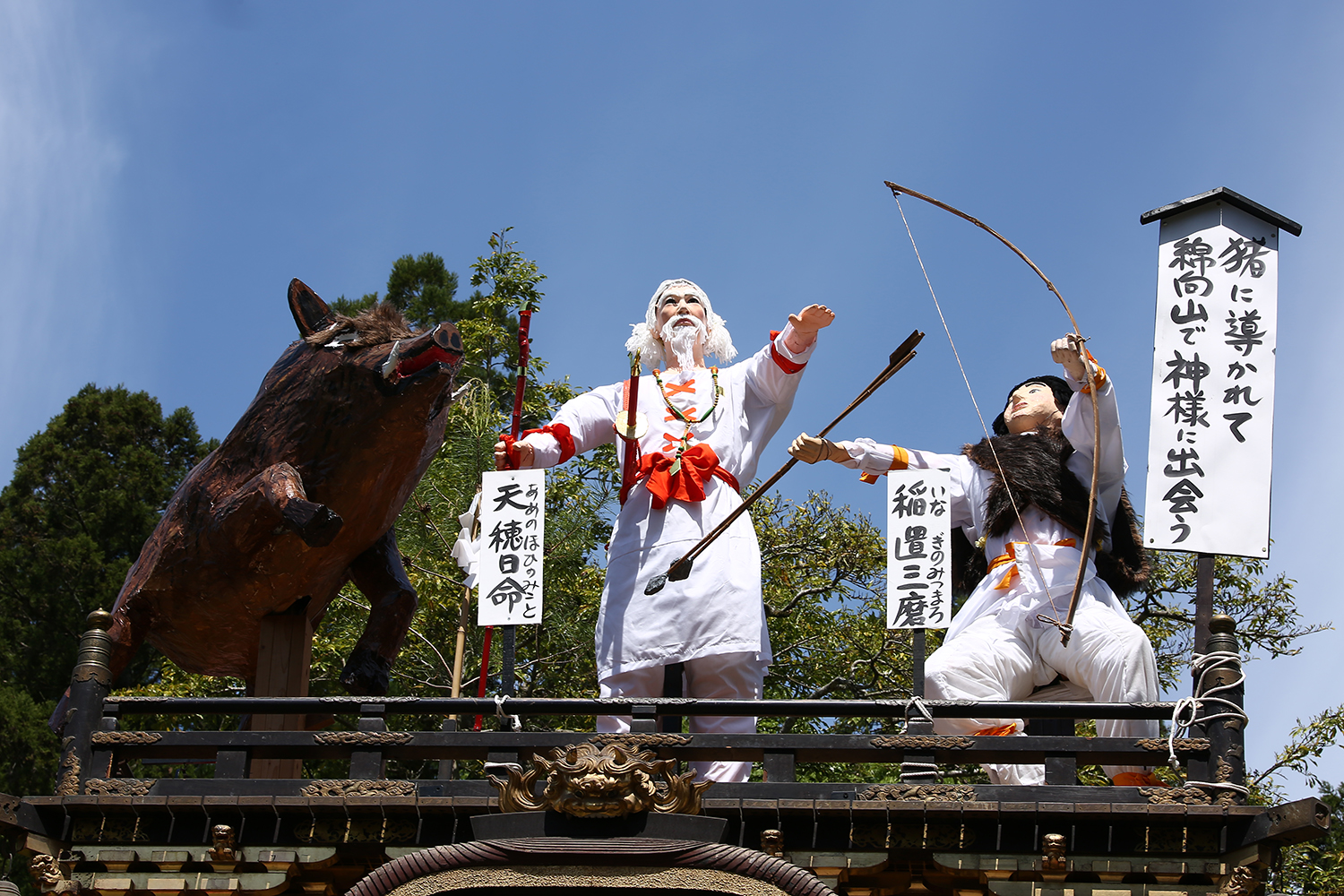 馬見岡綿向神社の神様がダシになっている曳山がありました。この地の豪族だった蒲生稲置三麿(かもうのいなぎみまろ)という人物が、猪に導かれて「天穂日命(あめのほひのみこと)」という神様に出会った場面を表しています。