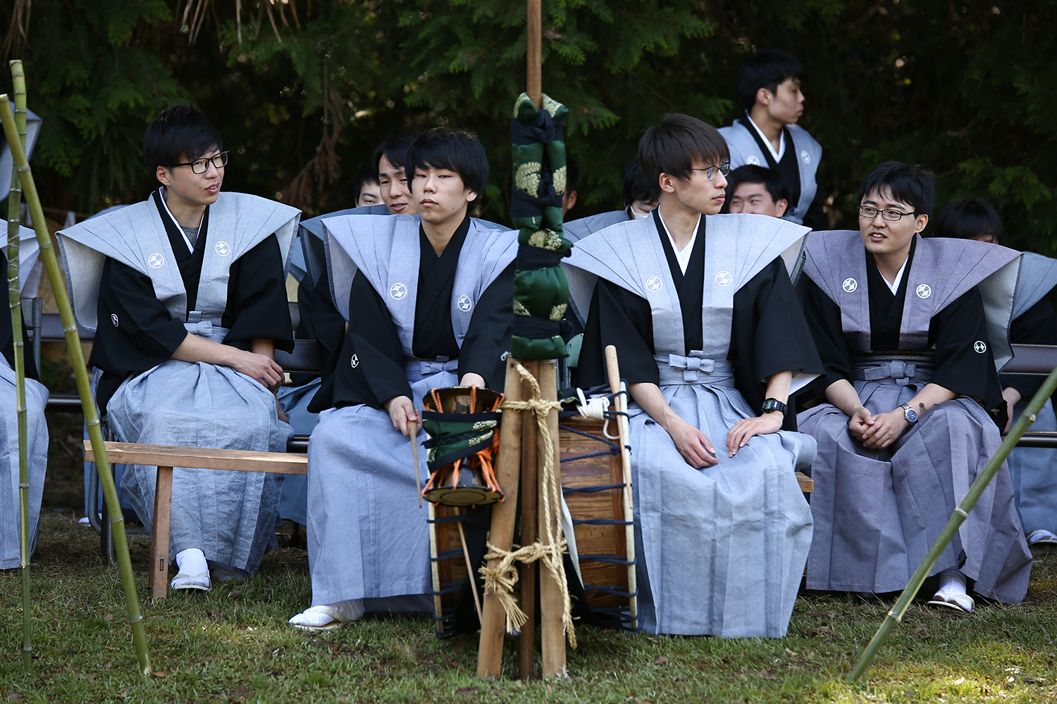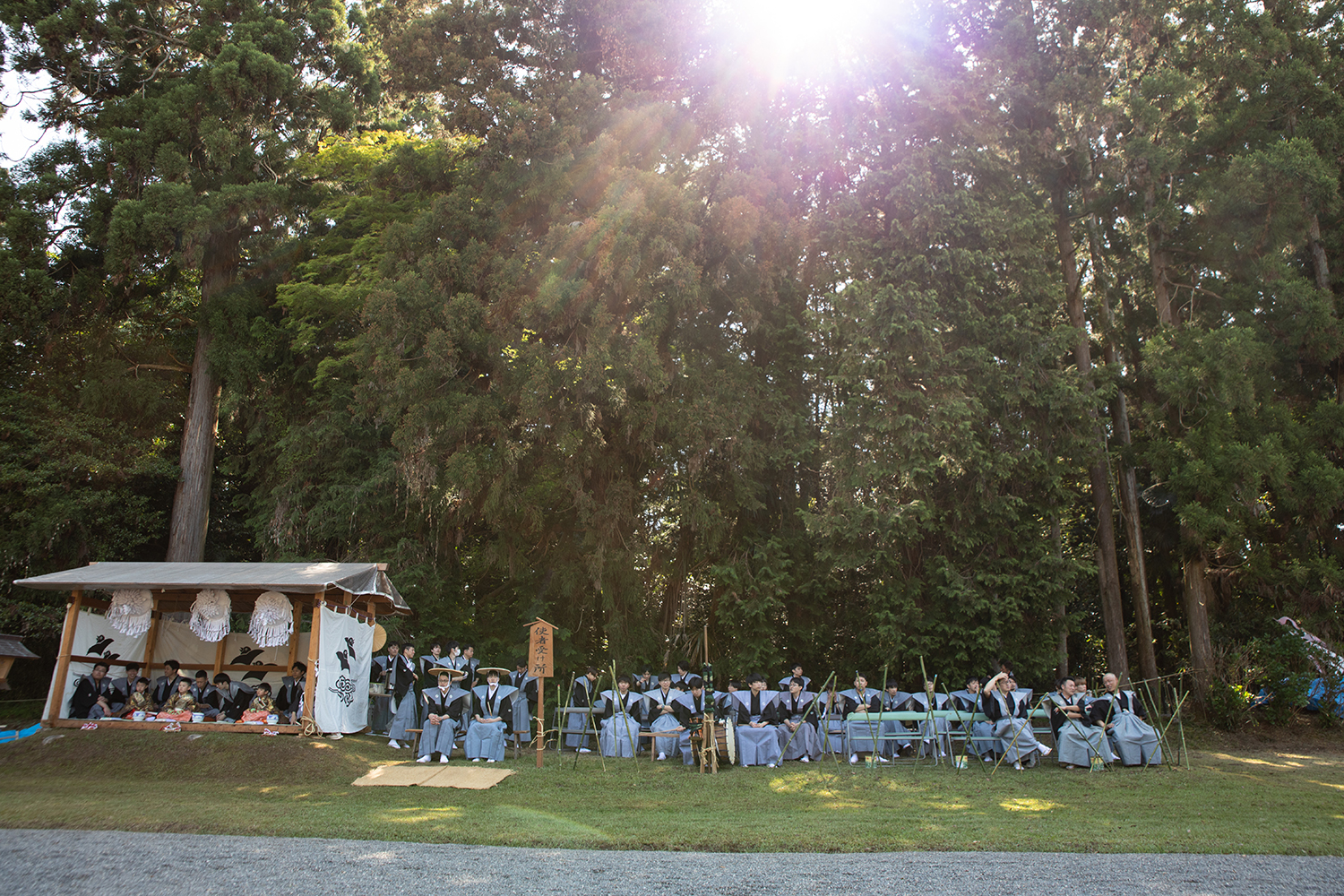 太鼓の音はどこから聞こえてくるのかと境内を歩いてみると「使者受け所」に、裃を着た「神調社(通称・芝田楽)」たちがずらりと並んでいました。神調社とは、祭を取り仕切る運営者のことです。