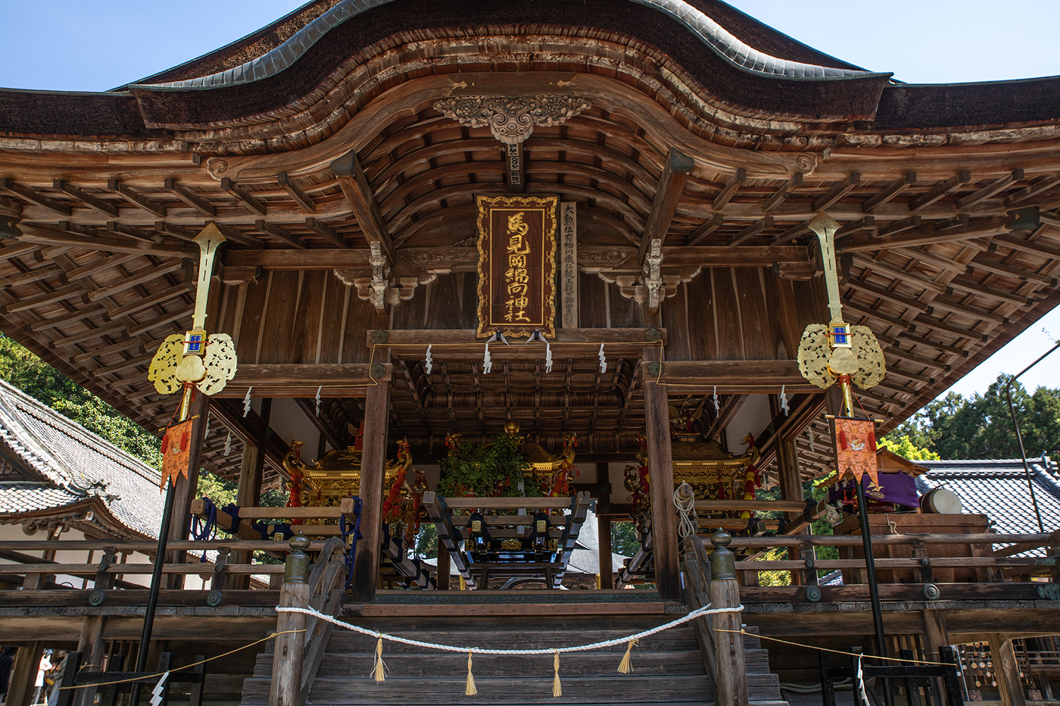 近江八幡駅から小一時間ほどバスに乗ってくると、お祭りの日は普段の停車場の場所と違い、馬見岡綿向神社の裏に停まりました。