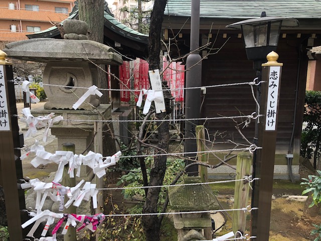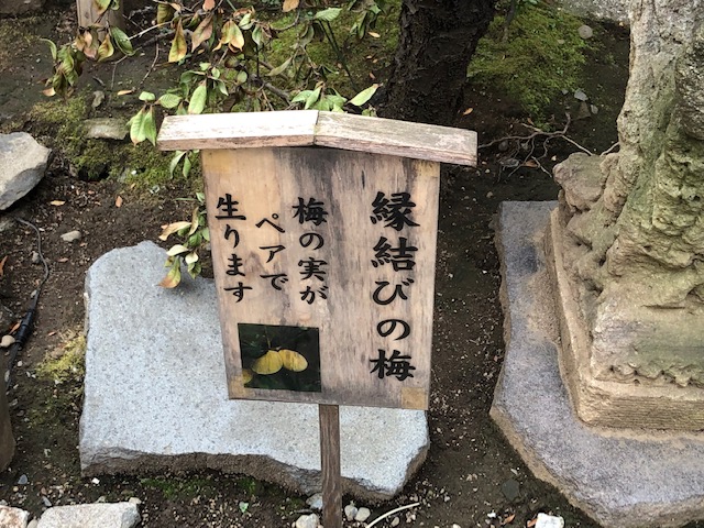 さて、本殿に向かって左側、恋みくじをかけるところに縁結びの梅があります。ペアで実ることから、恋の成就にパワーがあると言われています。実が成るのは6月頃でしょうか… 手を合わせて開運を祈ります。