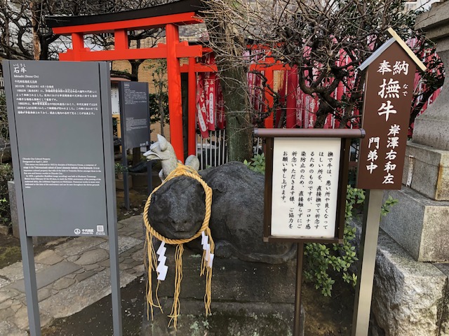 本殿に向かうとたくさんの石牛がおり、悪いところをなでると病気が良くなるという撫で牛もいます。