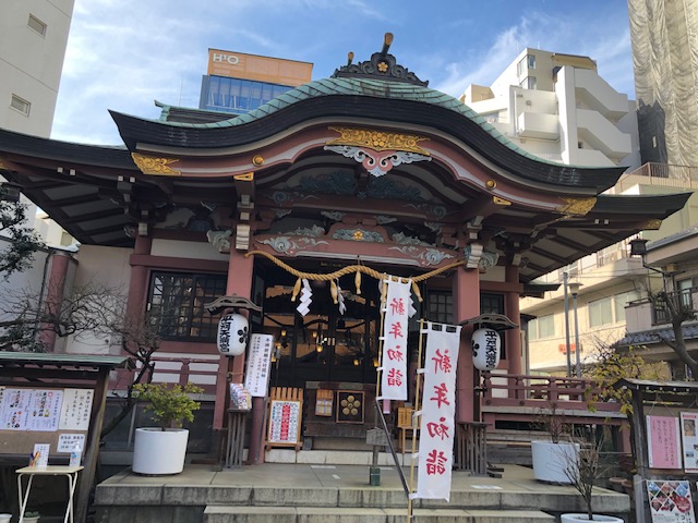 こちらは銅でできた鳥居で、高さ5メートル。千代田区内でもっとも古い鳥居だそう。台座には獅子の彫刻があります。正面が本殿。広さはそんなに大きくないのですが、すがすがしい空気に満ちており、木の陰で雀がたくさん鳴いているようです。年配のご家族、会社員風の方など、参拝客がとぎれず、熱心な信仰を集めている様子がうかがえます。