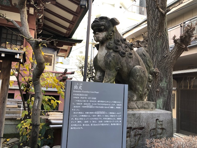 こちらは銅でできた鳥居で、高さ5メートル。千代田区内でもっとも古い鳥居だそう。台座には獅子の彫刻があります。正面が本殿。広さはそんなに大きくないのですが、すがすがしい空気に満ちており、木の陰で雀がたくさん鳴いているようです。年配のご家族、会社員風の方など、参拝客がとぎれず、熱心な信仰を集めている様子がうかがえます。