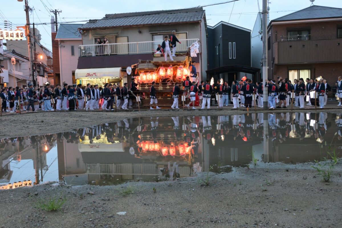昨年までここには信用金庫があったのですが、今年は空地になっており、雨がたまって大きな水たまりになっていて、その水たまりに提灯を付けただんじりが綺麗に反射していました。