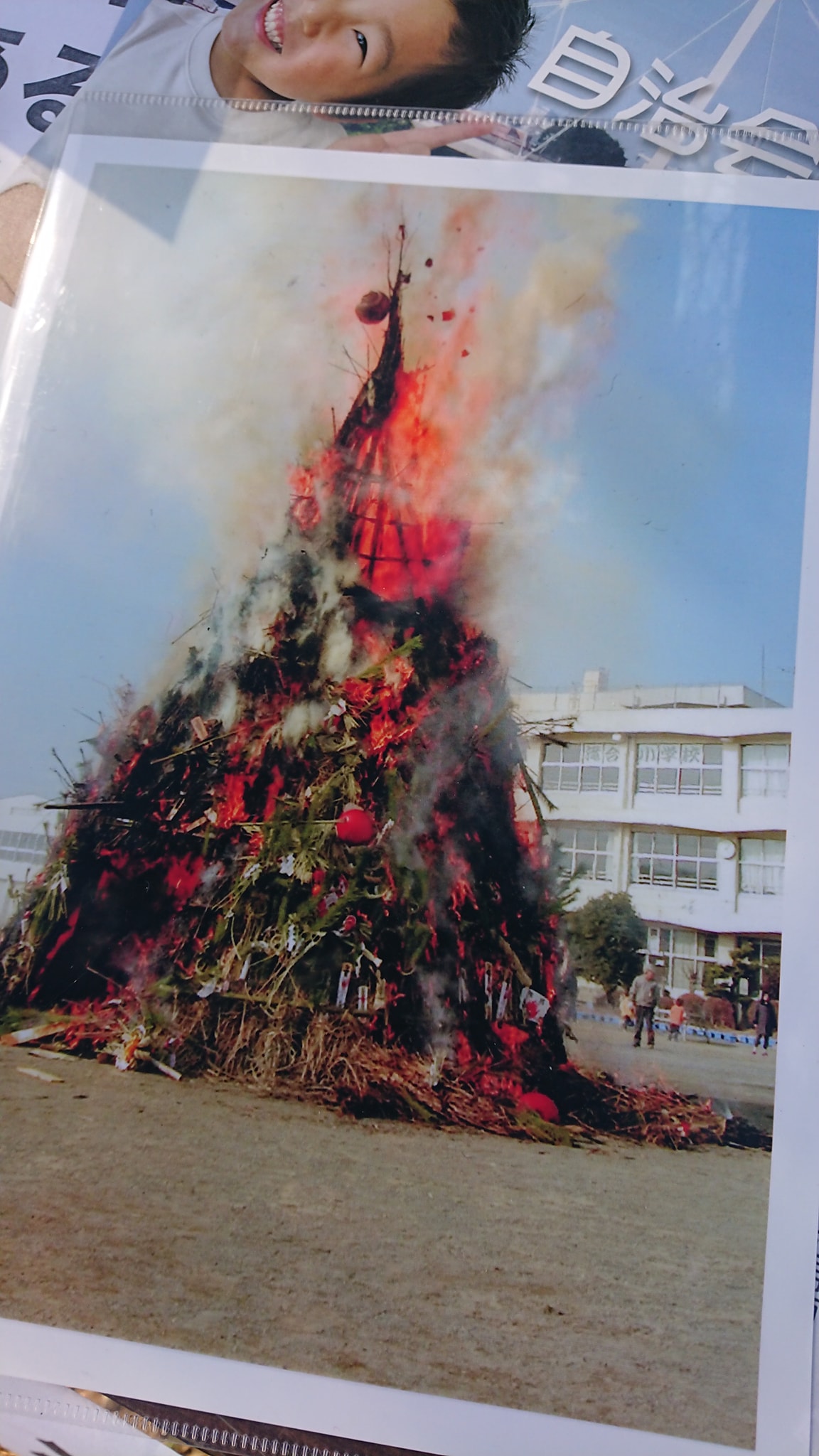 こちらは会場にあった、かつての滝合小学校でのどんど焼きの写真です。赤いダルマや緑の松飾りがモリモリと黒く黒く燃え上がっております。現在の環境では、ここまで大きいやぐらは組めませんが、その代わり焼き芋や防災イベントなどの様々な要素を盛り込むことで参加者が楽しめるよう工夫されておりました。地域の伝統を大切にしつつ、時代や環境にあわせて取り組んで行く姿勢を学ぶことができます。