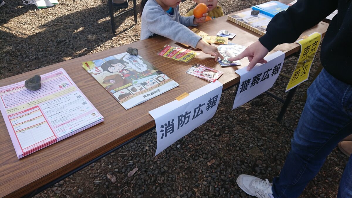 正月飾り等を焚きあげる様子は先程ご覧頂きましたが、焼き芋から防災イベントまでその他の工夫について、写真を中心に見て行ければと思います。上の写真では、消防広報や警察広報のチラシ配布されており、防災・防犯などの参加者意識の向上が図られています。この受付周辺で焼き芋の無料配布券も配られていました。