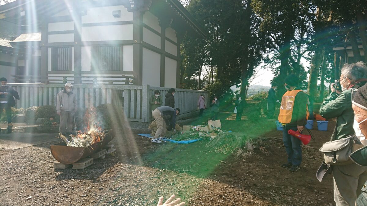 こちらが実際のどんど焼き会場の写真となります。写真の左に見えるのは前述した平山八幡神社の建物です。新型コロナ禍の開催でしたので、密にならず参加者の皆さん自然と間隔を取っております。どんど焼き特有のやぐらはつくられず、一般的な神社等で行われるお焚き上げの拡大版といった感じでした。