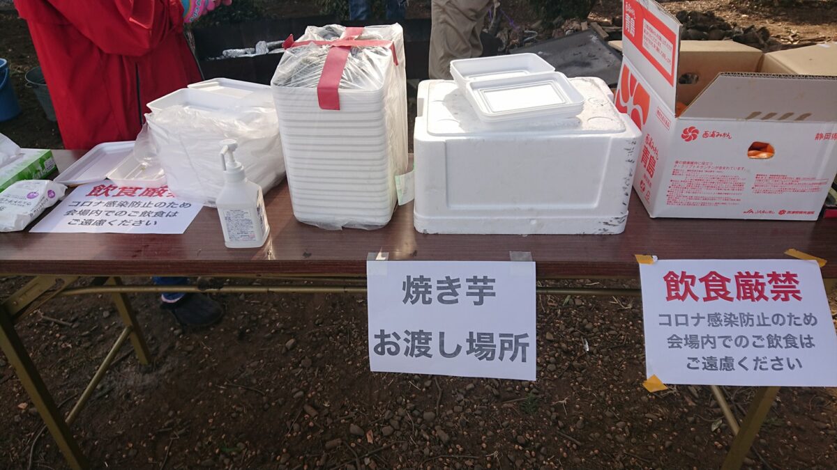 こちらが焼き芋のお渡し場所となります。感染症対策も施され、焼き芋が終わってしまった場合に備えて、みかんも準備されておりました。