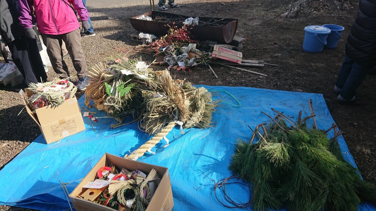 こちらがどんど焼きで焚きあげる松飾り等になります。かつての滝合小学校でのどんど焼きのように多くのお正月飾りが集まっている様子はありませんが、これらがこれから焚きあげられていきます。実際の焚きあげの様子は以下の動画をご覧頂ければと思いますが、燃えやすい枝に着火させ、その上にしめ縄等の正月飾りを徐々に載せることで大きな炎となります。