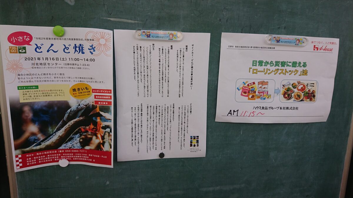 掲示板にはどんど焼きの開催案内チラシや、どんど焼きの詳細な解説について記されたチラシが掲示されており、その右にはハウス食品の防災講座の案内もありました。ライターは講座には出席できませんでしたが、「ローリングストック法」というものが紹介されています。日常的に食べている食品を備蓄し、定期的に消費し、食べた分を買い足すという備蓄方法だそうで、詳細は農林水産省のページが参考になります。