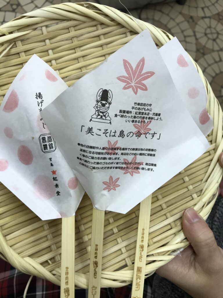 紅葉堂の揚げもみじは串に刺さっていて、食べ歩きにも抜群です!ふっくら柔らかいもみじまんじゅうを揚げたことにより、まわりはサクサクアツアツ!中はふんわりと食感の違いを楽しめます。こちらもぜひ、宮島にお越しの際は、味わってみてくださいね!