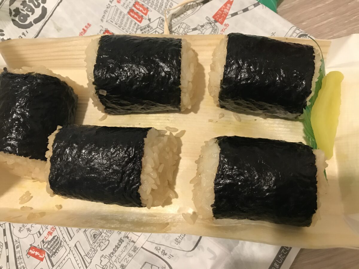 中には、俵型のおにぎりが5つ。味は、梅・こぶ・かつお・おしんこ・しば漬の5種類でした!実食してみると、ふんわりとしたご飯、絶妙な塩加減、香ばしい海苔と、とてもシンプルなお弁当ですが、そのシンプルさゆえに、何度も食べたくなってしまう、魅力的なお弁当です。朝・昼・晩・夜食と、どの時間帯にもオススメです。