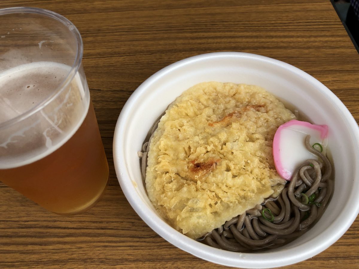 さっそく遊ぼう。でも、暑い! というわけで、まずは麦酒をいただきます。小腹が空いていたので天麩羅蕎麦も一緒に。