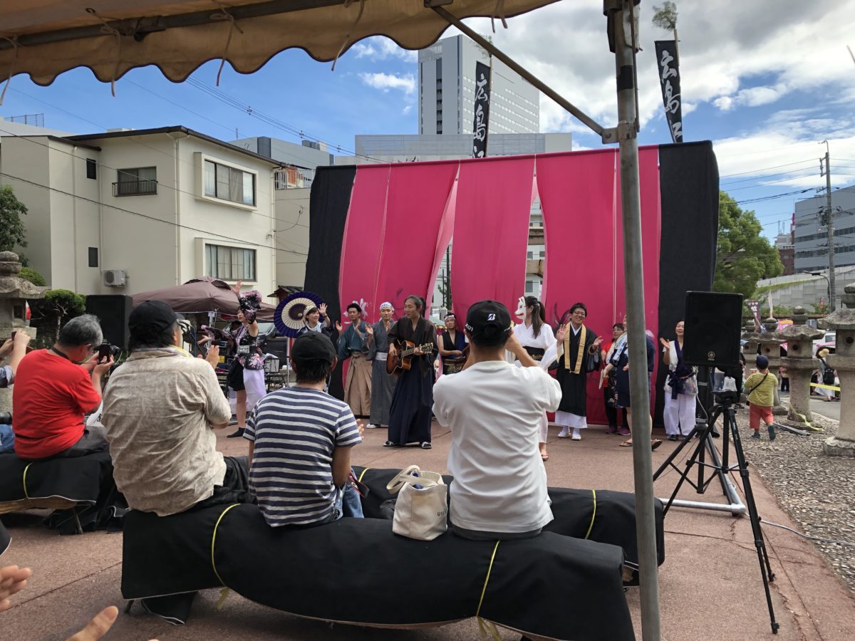 神社入り口、鳥居の裏手にしつらえられた紅い垂れ幕には、書道アートによる大きな大きな花模様が施されていました。その幕を仕切りとして用意されたのが屋外ステージです。お祭り二日目は雲があれど太陽まばゆい晴天、午後のステージを容赦なく照りつけていました。