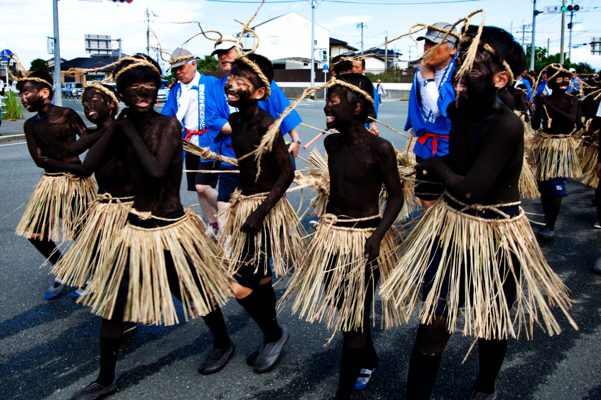 集まった子供は50人程、10時から始まる祭に向けて、次々とススを塗られていく。指先から首、目の周りまで真っ黒になった子供達は、恐ろしい鬼というより、ヤンチャで悪戯好きなゴブリンのように見えた。ススを塗られている時は大人しくしているのに、真っ黒になってしまうとやたらと元気に走り回るようになる。「ほら、まだじゃろ」と装束を着せようとする大人が張り上げる声も混じり、ちょっとした御祭り騒ぎ状態だ。