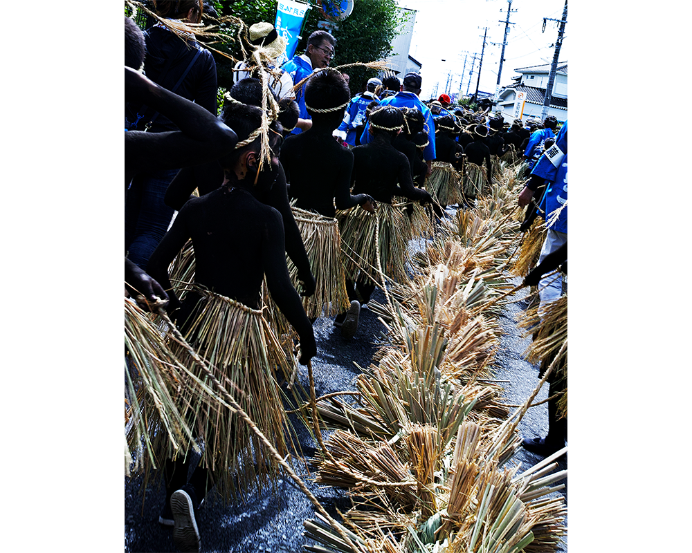 盆綱曳き当日、朝から祭りの準備で人が集まり、熊野神社近辺は賑わいをみせる。身体にぬるススを用意する者、装束を準備する者、元気あふれる子供を誘導する者、熱中症対策にあれこれ準備をする者、大勢の人々が忙しそうに行き来していた。境内の西端にある観音堂では、大人たちが大汗をかいて大綱を練りあげている。直径30cm、長さ20メートル、重さ約400kgとなる大綱を練り上げる作業は、かなり根気のいる作業だろう。大綱創りは、準備というよりも、神事の1つであるように感じた。祭はまだまだこれからだが、大人達の真剣な面持ちに胸が熱くなる。子供を中心とした祭で、大人がここまで真剣でいることができる地域はそう多くない。この祭りが大切な鎮魂であることを思わせる、良い時間が流れていた。