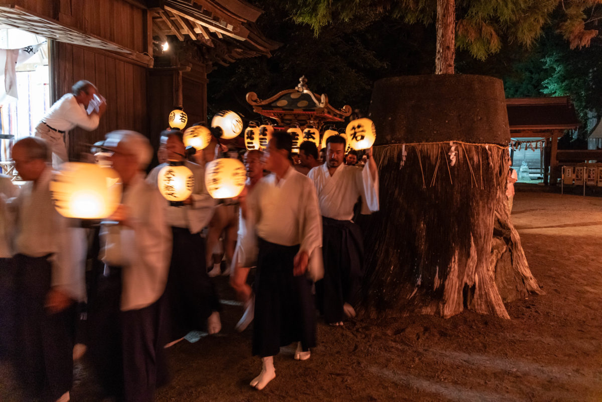 神事を終えると、いよいよお宮出しです!対抗する男衆を跳ね除け、ご神木の横を通れるまで境内を廻ります。