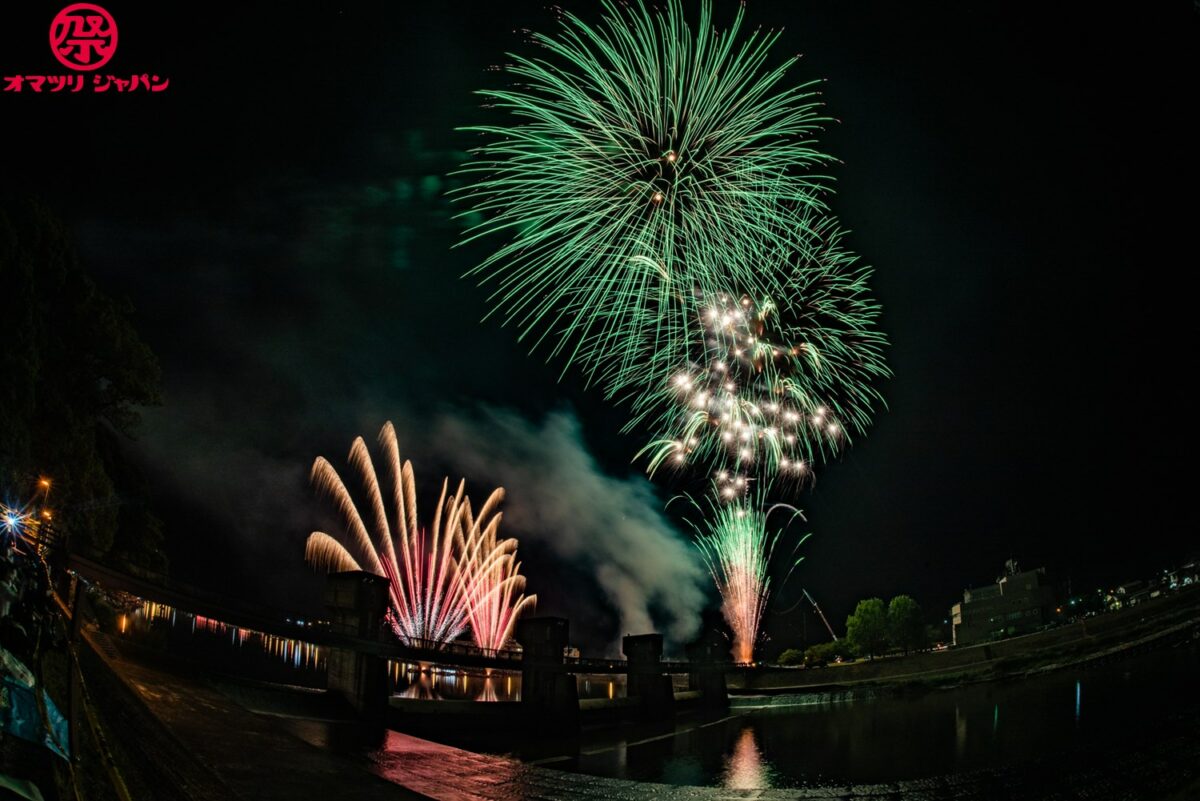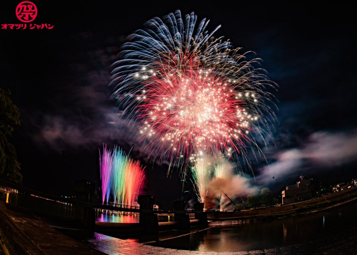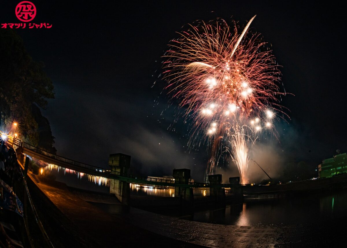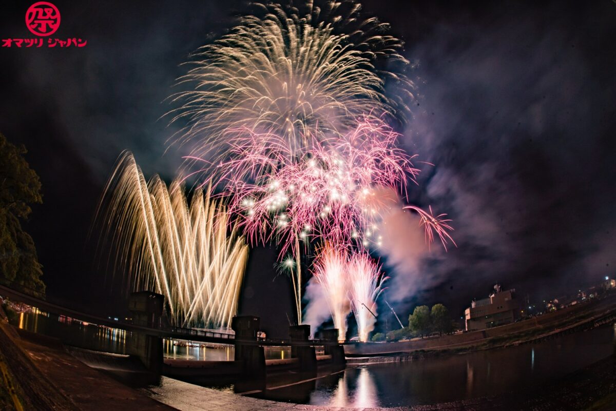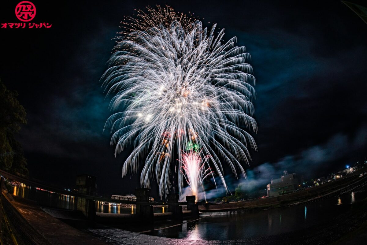 夕方になると屋形船が浮かび、中洲より上げられる花火が山に囲まれた盆地に響き渡ります。