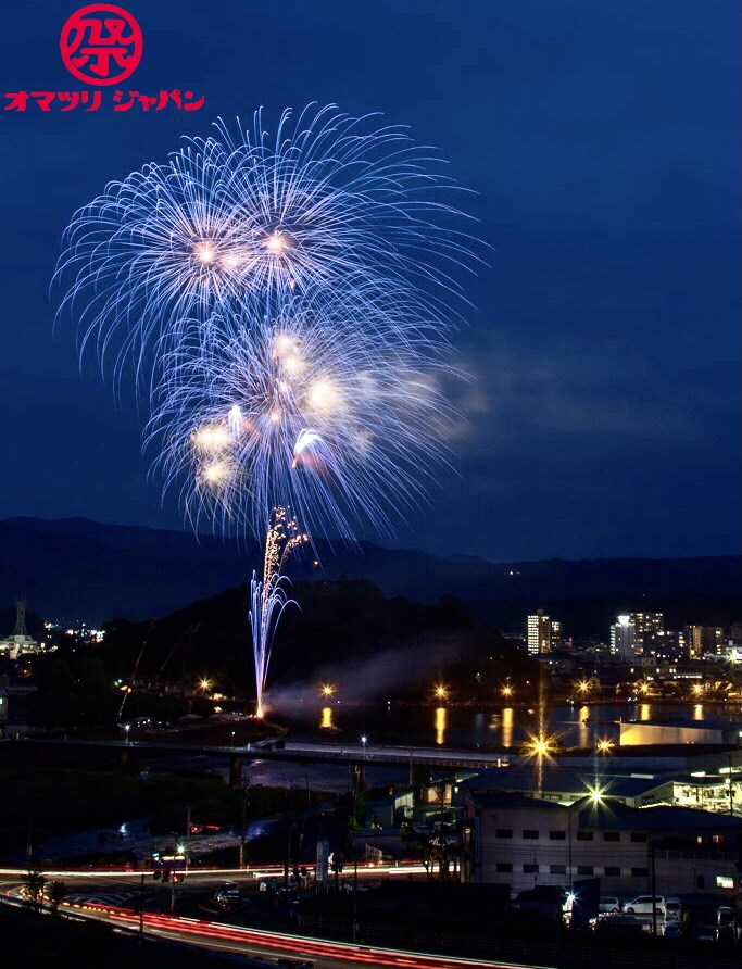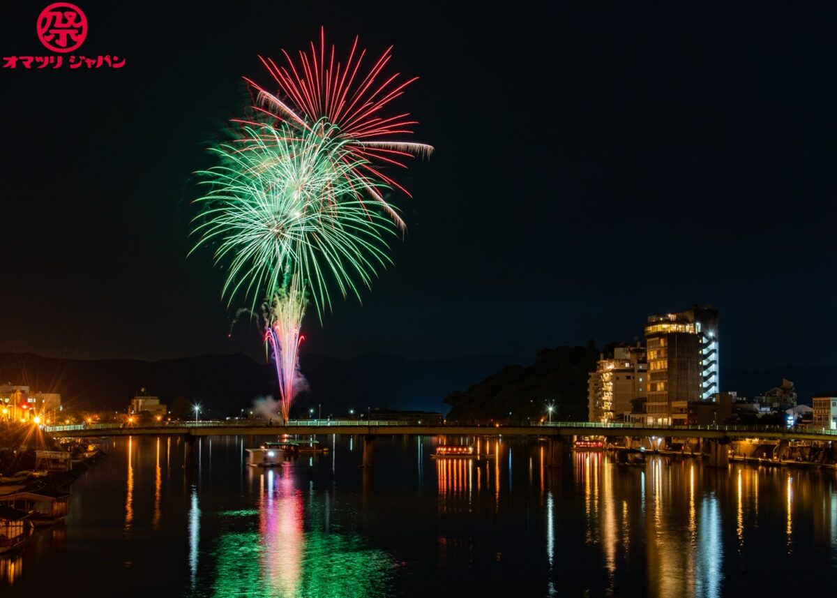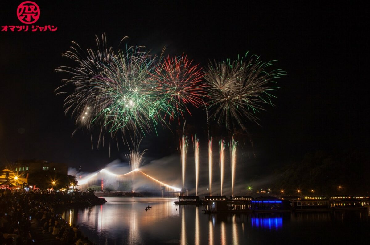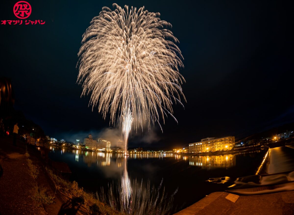 夕方になると屋形船が浮かび、中洲より上げられる花火が山に囲まれた盆地に響き渡ります。