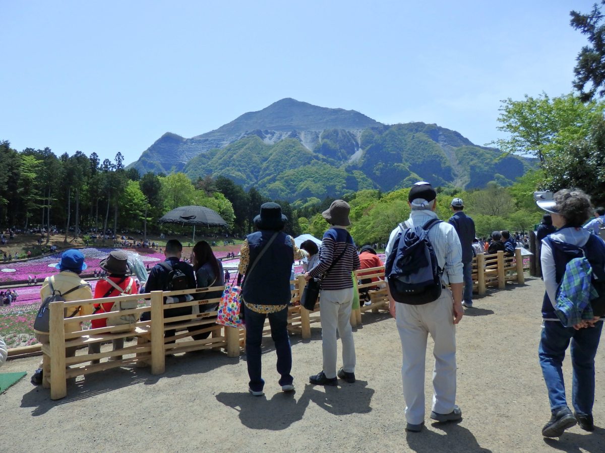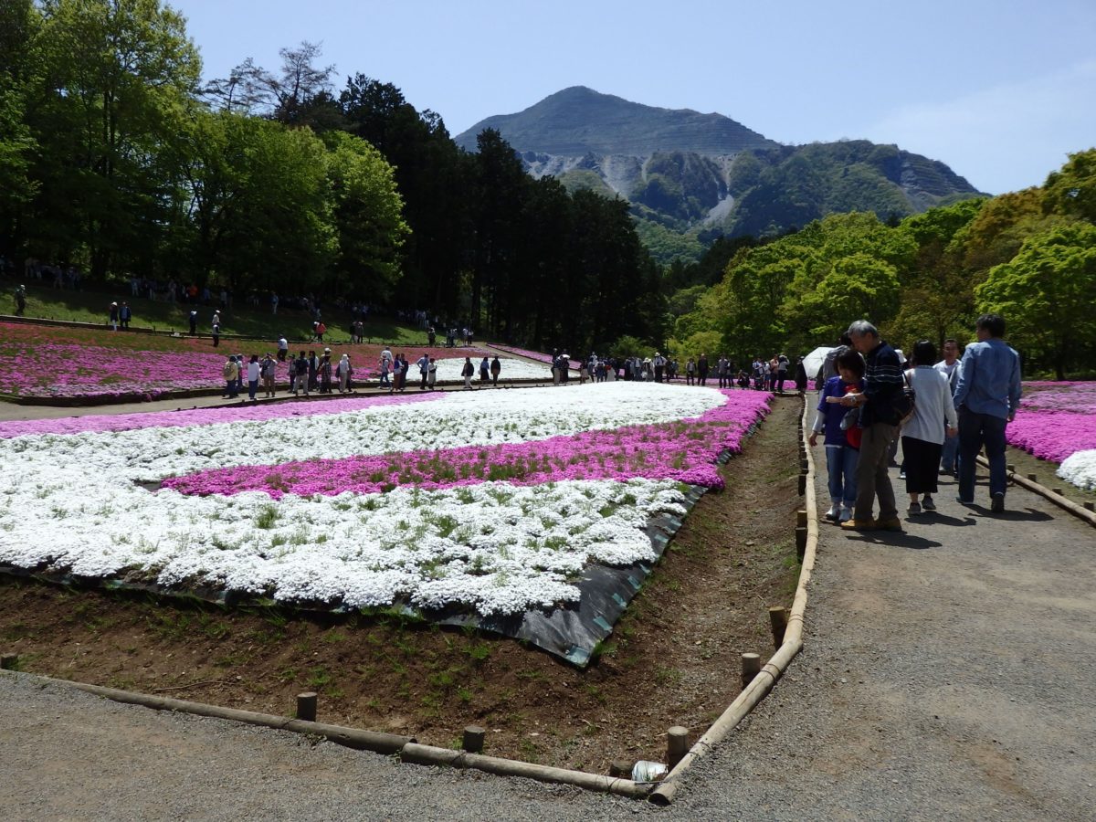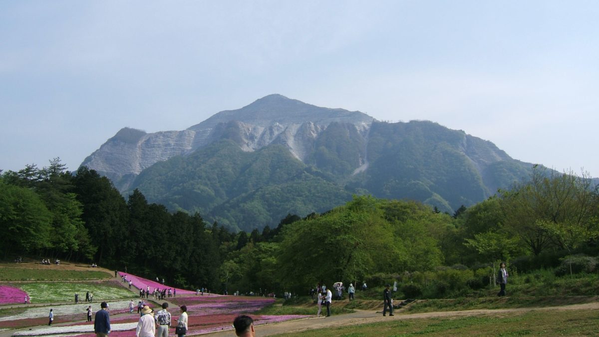 芝桜の丘の地表を覆う芝桜越しには、今でも石灰岩の採掘が行われている武甲山が威容を見せてくれます。