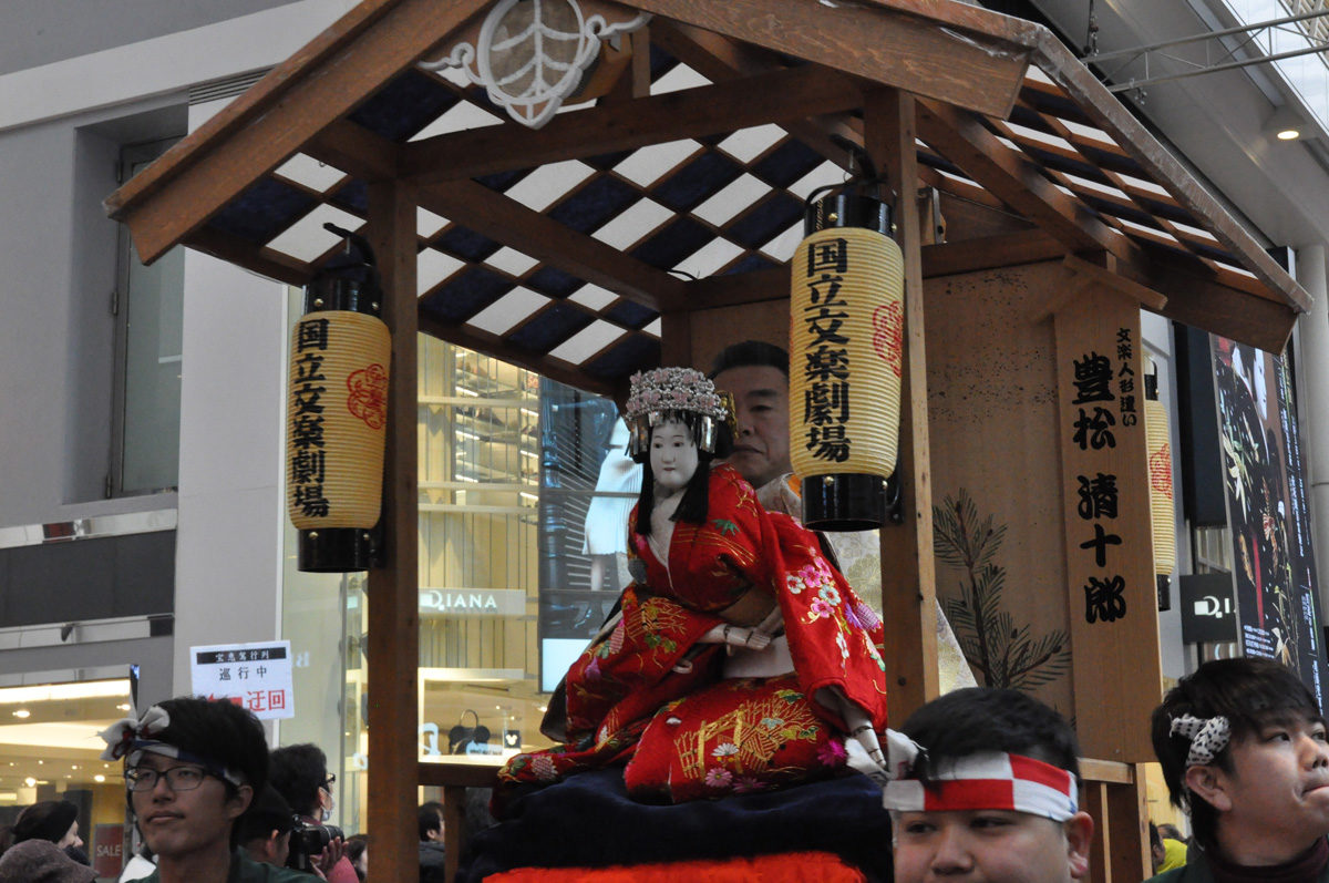 大阪に来たら一度は記念に訪れたい「えびす橋」。そのたもとには伝統芸能や演奏の奉納を行う「戎舞台」が臨時設置され、2019年は文楽「寿式二人三番叟」などが披露されました。
