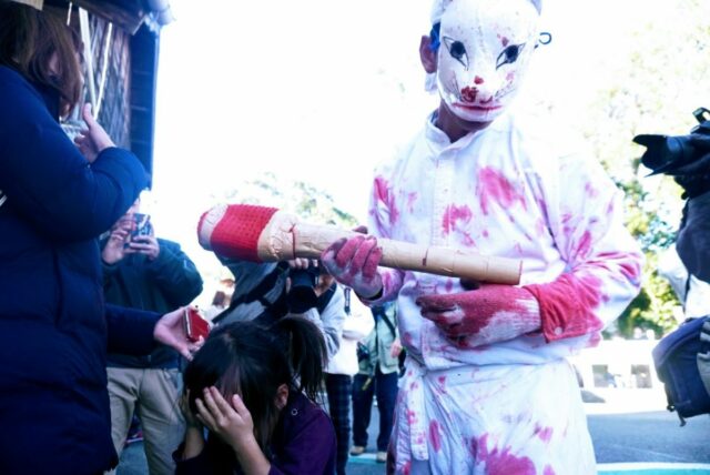 「どんき」祭りは、愛知県豊川市御津町のお祭り。火防の祈祷の後に行われる行事で、青天狗、赤天狗、白狐の三者が撞木(しゅもく)を持って子どもたちを追い回し、捕まえては紅ガラを塗りたくるという奇祭です。