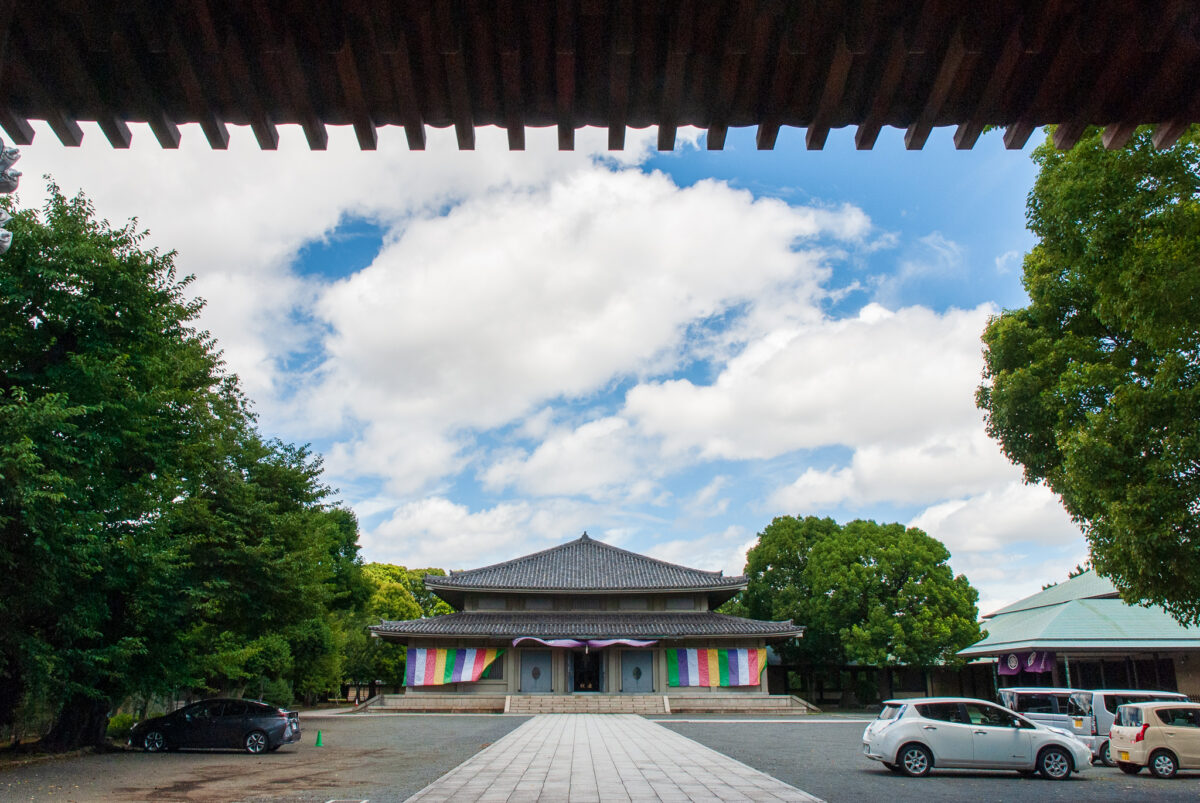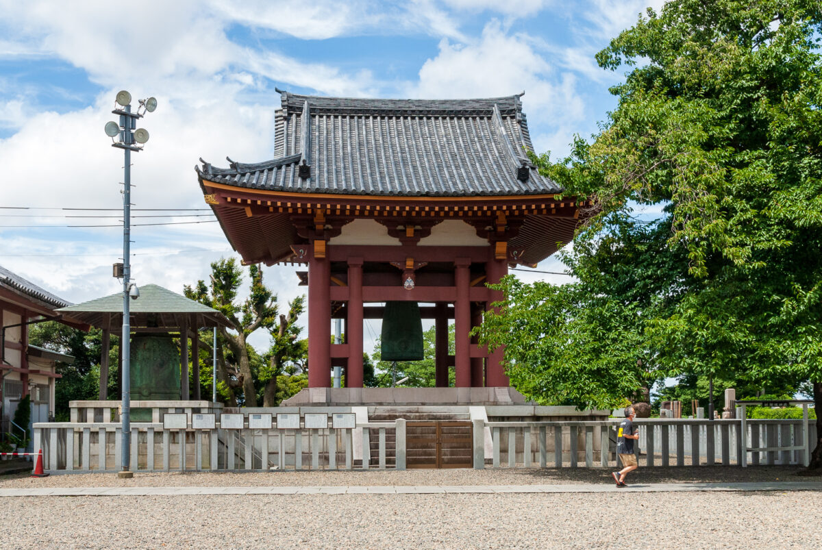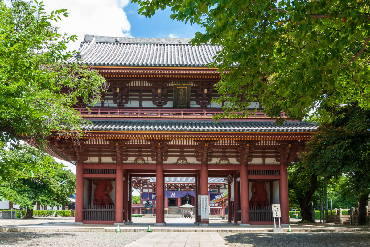 大堂正面に建つ二重門。旧国宝の山門および仁王像は共に昭和20年(1945年)4月15日の米軍による空襲で焼失。三門は昭和52年(1977年)に再建、仁王尊は昭和54年(1979年)に新造されました。旧三門は、慶長13年(1608年)に徳川2代将軍秀忠が五重塔と共に建立。旧仁王尊は、和銅3年(710年)行基菩薩作の古像であったと伝わります。