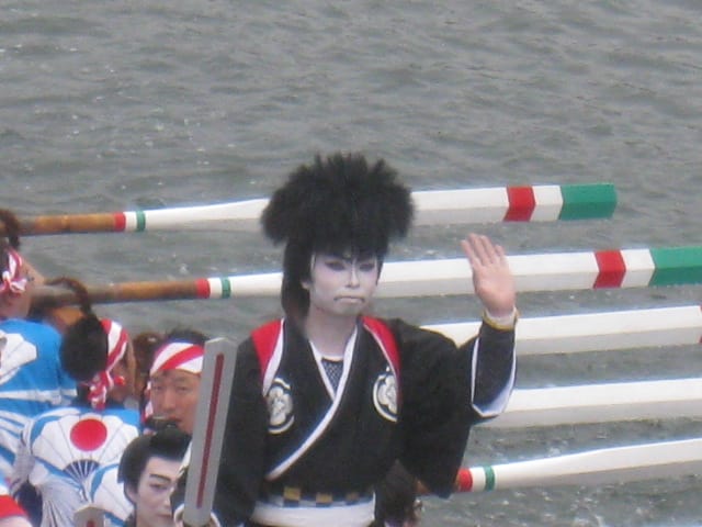 そして花形の舳先で踊ってるのが、威風堂々見得を切る歌舞伎風衣装の剣櫂!踊りが独特です。写真はありませんが艫で艶めかしく身をくねらす女姿の采振りが見どころです。見るなら低い位置から見るのがいいのですが、これまた大変です。以下は私が10年前に松江大橋から手を伸ばして撮った写真です。記事の内容は伝承館で頂いたパンフレットを参考に書かせていただきました、ありがとうございました。