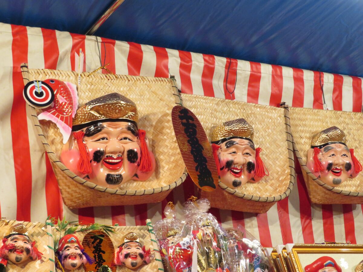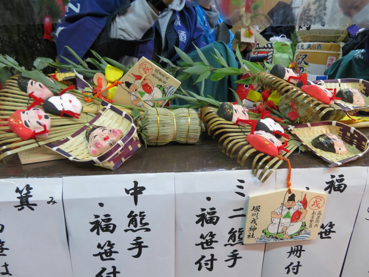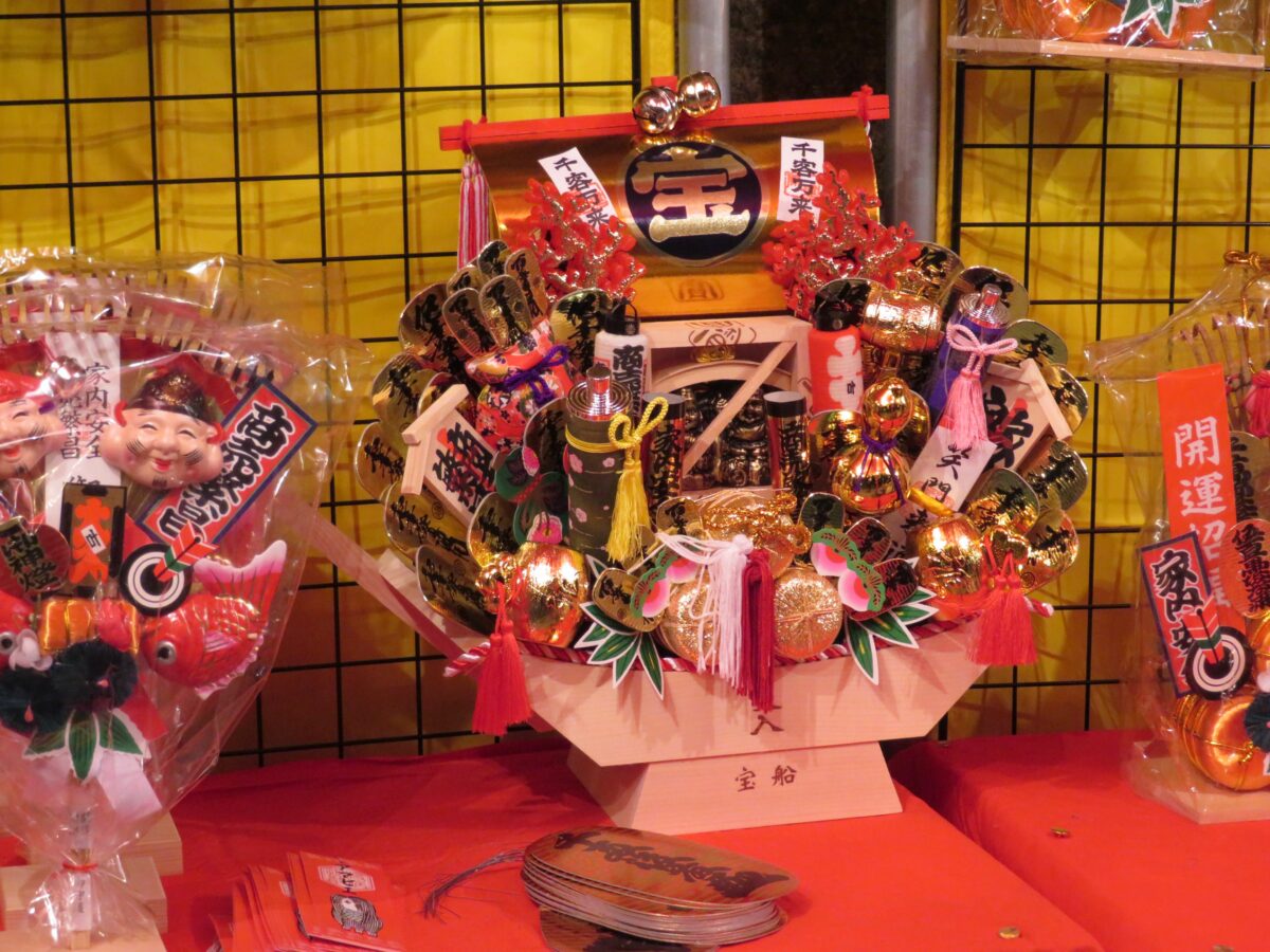縁起物には豊富な種類が揃っています。福笹をはじめ、熊手、福箕、宝船、福俵などに恵比寿様、お多福、大判小判、鯛などがデザインされます。熊手を使えば福をかき込むことができるでしょう。福箕では福をすくいとることができるでしょう。また、御朱印には神社名の文字の上に、宝船の印が重ねられます。