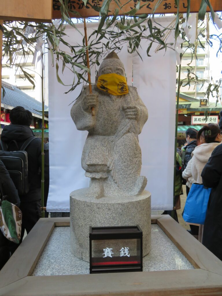 堀川戎神社は6世紀、欽明天皇の時代に止美連吉雄(とみのむらじよしお)が、蛭子大神を富島に祀ったことが起源と伝わります。蛭子大神は古くから大漁祈願にご神徳があるとされてきましたが、商売繁昌、産業発展のご利益が期待されるようになりました。関西地方では「戎大黒福の神」として親しまれています。正面の鳥居を潜ると「福興戎像」が穏やかな表情で出迎えてくれます。
