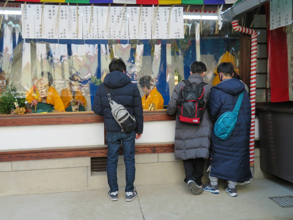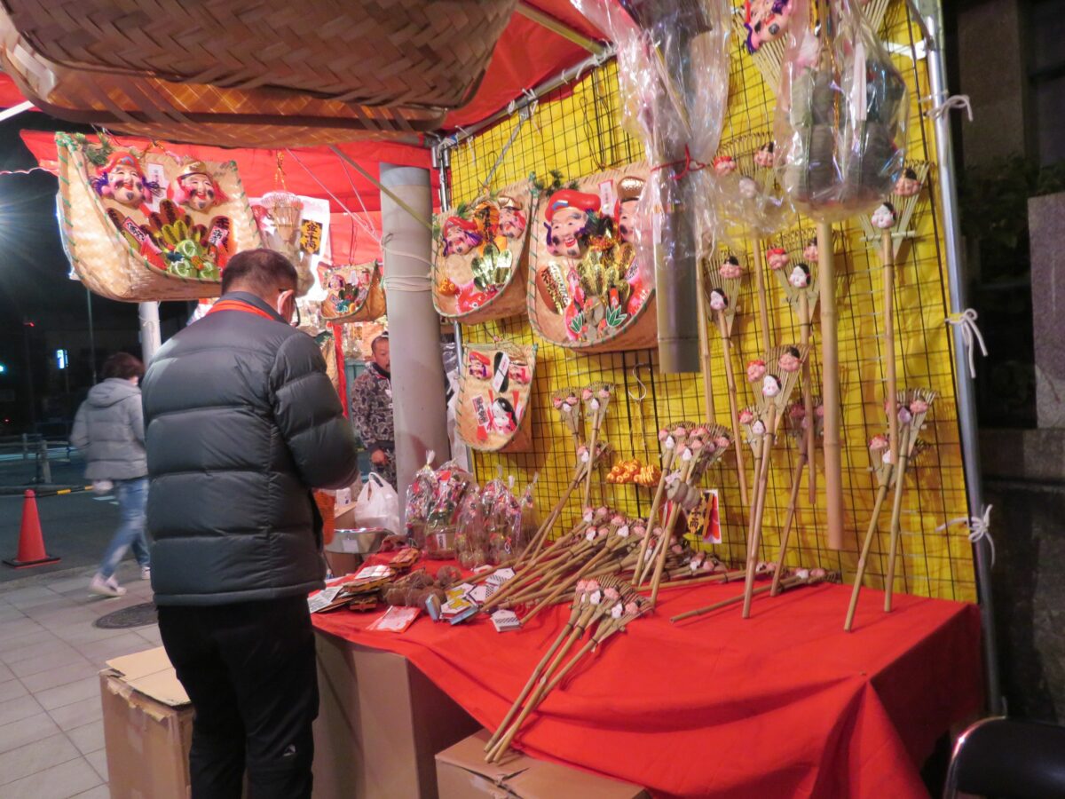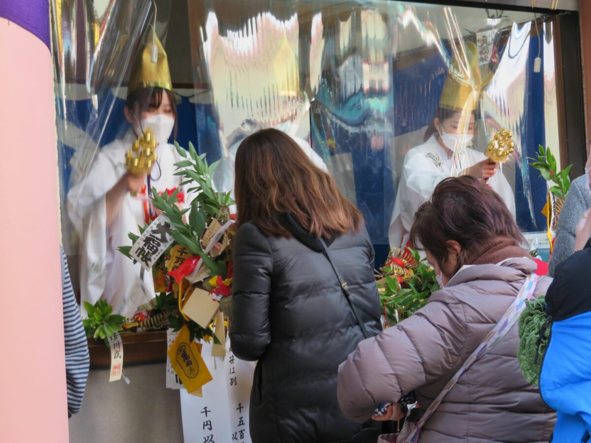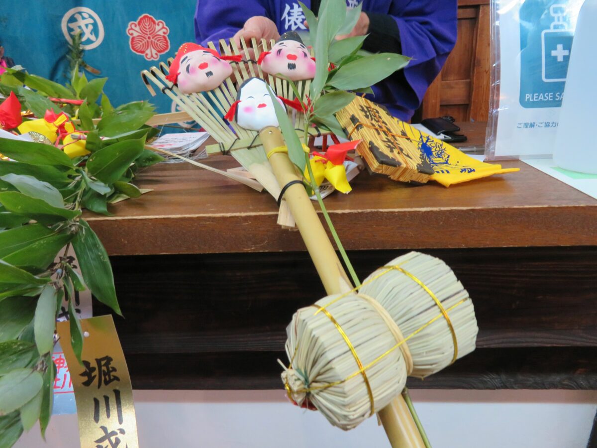 「堀川戎」が開催される3日間は、境内や鳥居は縁起物で取り囲まれます。縁起物を頂くときには福娘が鈴を鳴らしながら、商売繁盛や家内安全を祈ってくれます。拝殿では昇殿特別神楽も行われます。