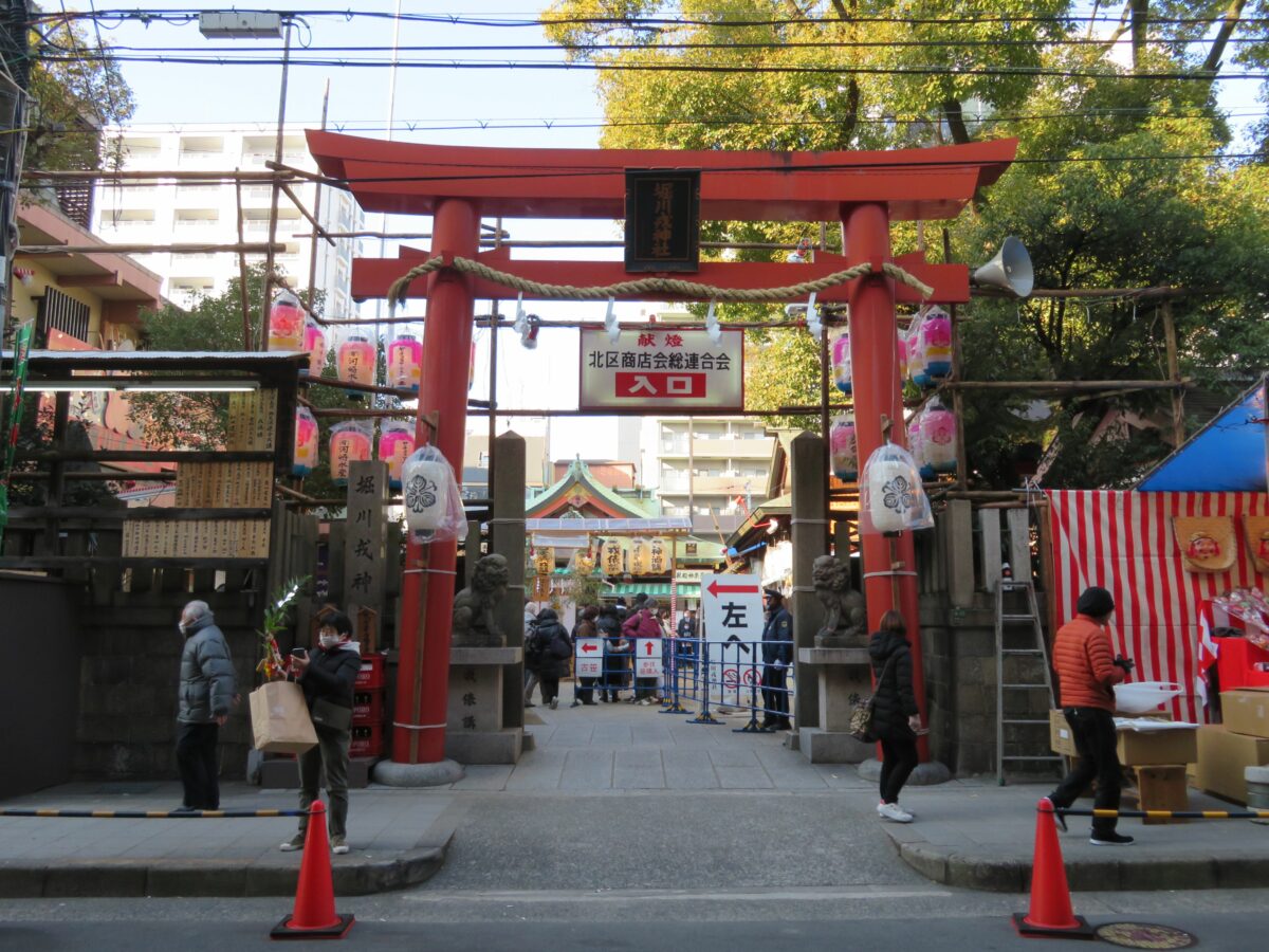 大阪市北区の堀川戎神社では例年1月9~11日に「堀川戎」が開催されています。年のはじめに「商売繁盛で笹持って来いっ」のお囃子で、商売繫盛や家内安全を祈ります。関西の各地で行われる「十日戎」の中でも規模が大きく、大阪では「ミナミの今宮、キタの堀川」と並び称せられています。3日間、境内は多種多様の縁起物で溢れ、神社に繋がる参道の両側には露店が隙間なく並びます。