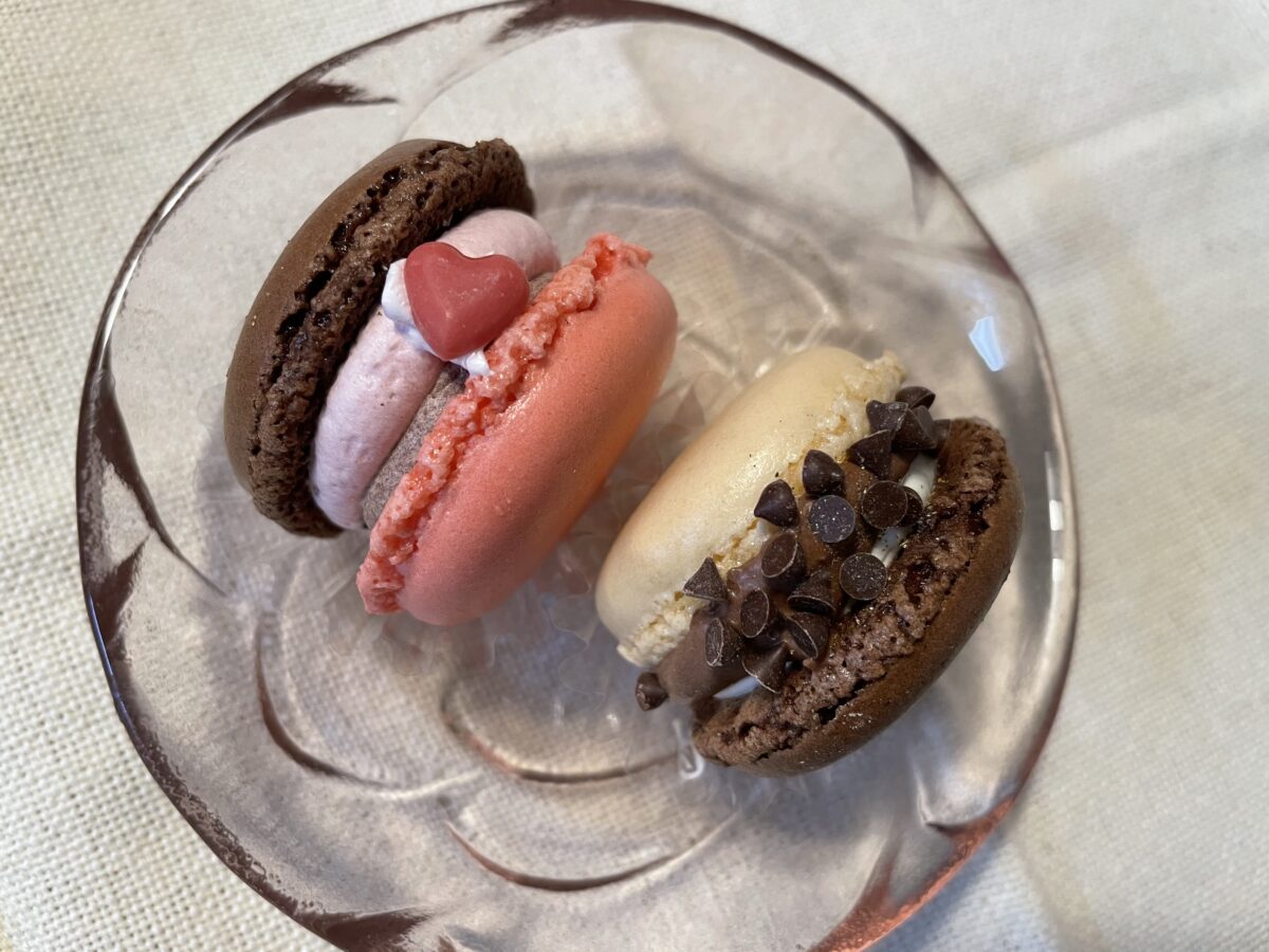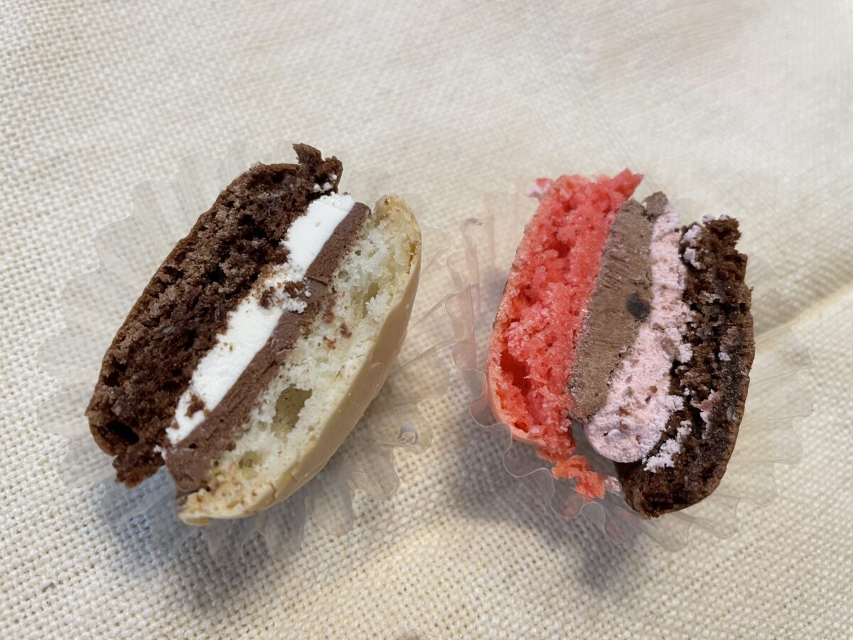 チョコは、ビターなチョコレートクリームと生クリームがマカロンにサンドされていて、マカロンの生地は「さっくり」と「しっとり」を感じる歯ごたえ。アーモンドの風味を後から感じます。トッピングのチョコチップもとてもよいアクセントになっています。
