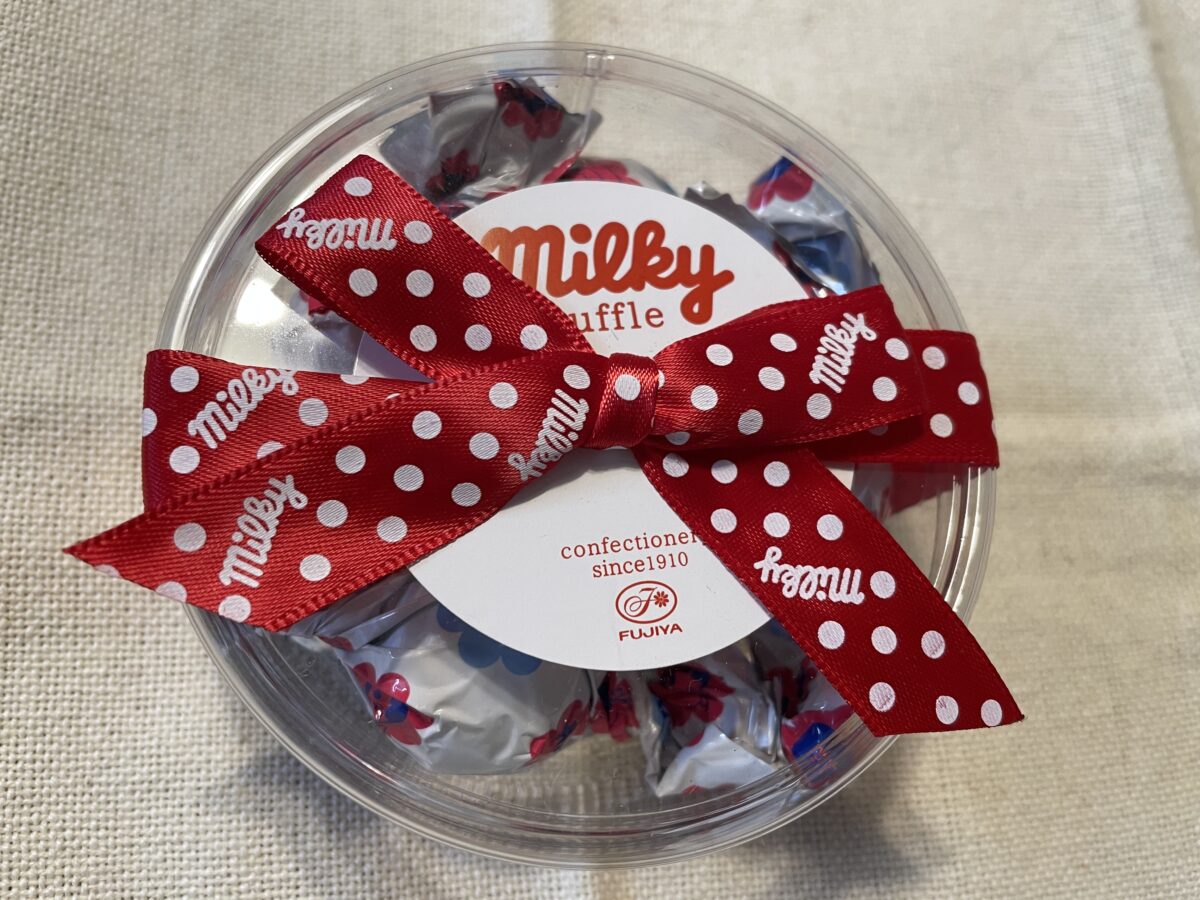 「♪ミルキーは、ママの味~♪」やっぱり、不二家と言えば、「ミルキー」ではないでしょうか??この、「ミルキー」がバレンタイン限定で、チョコレートになりました!その名も「ミルキートリュフ」です!「ミルキートリュフ」は5個入り(税込600円)、10個入り(税込み1,000円)で、今回は、5個入りを購入しました。【milky】と書かれた赤いリボンが可愛らしいパッケージに、ミルキー定番の包みで個包装されています。