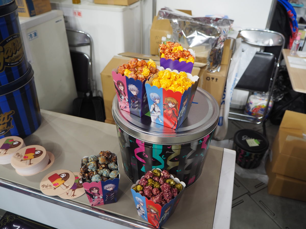 エヴァコラボ!第3新東京市ブースではギャレットのエヴァカラーポップコーンも発売中。