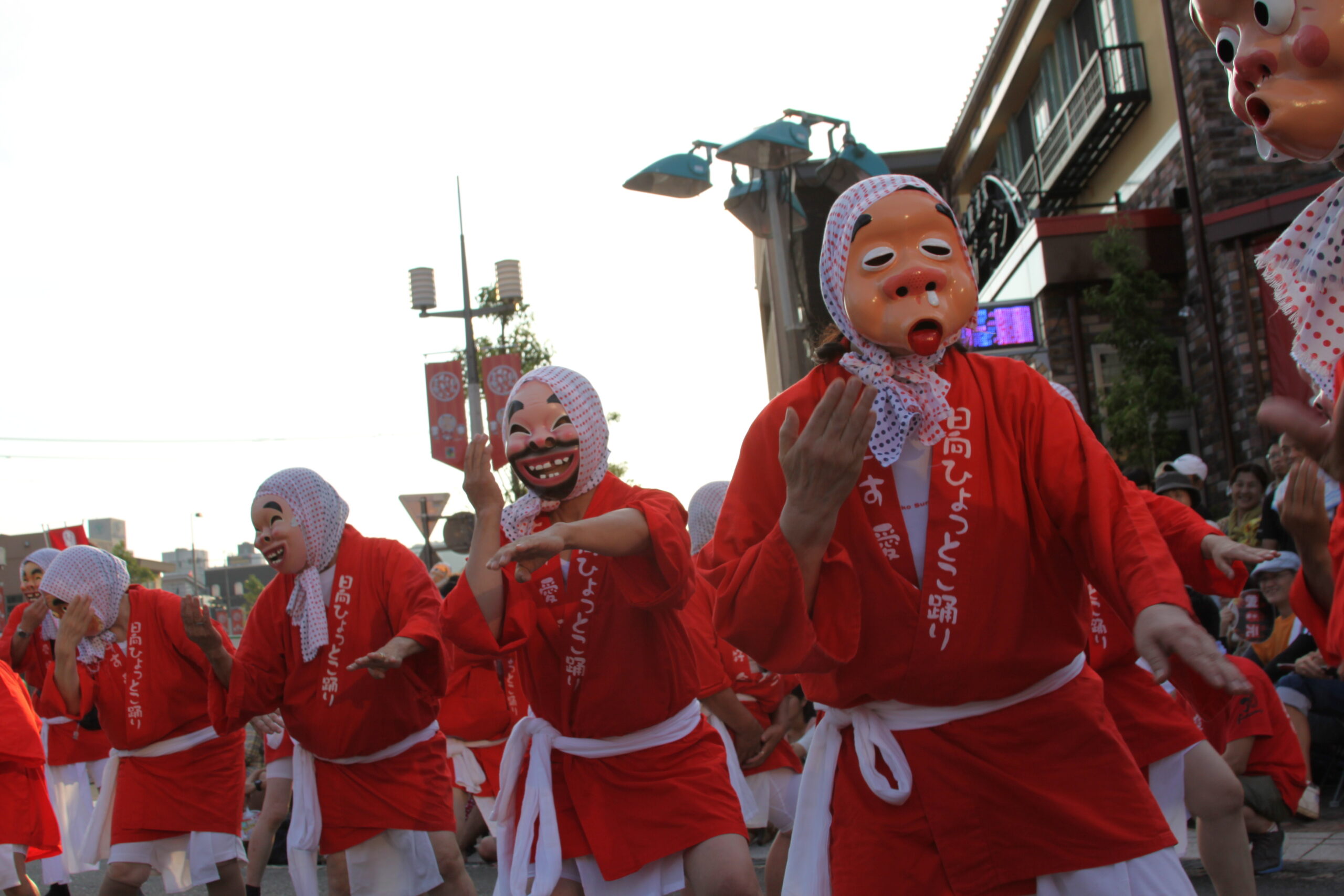 パレードが見どころの一つ。参加者がひょっとこ、きつね、おかめの仮面をかぶり、赤い着物を身にまといながら踊る様子は日向の街をひょっとこの赤一色に染めている。衣装は、伝統を受け継ぐ橘ひょっとこ踊り保存会が監修する。