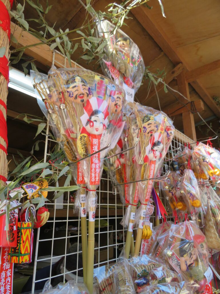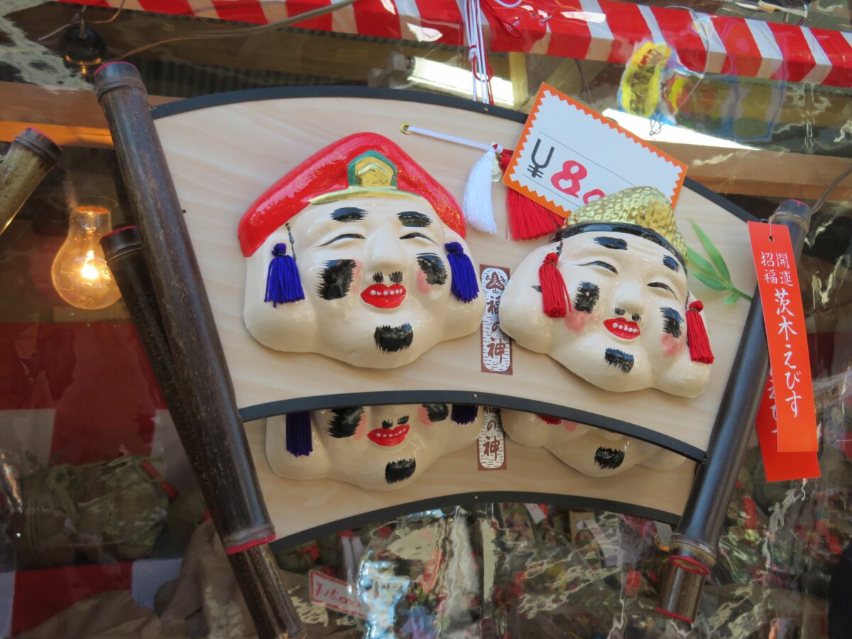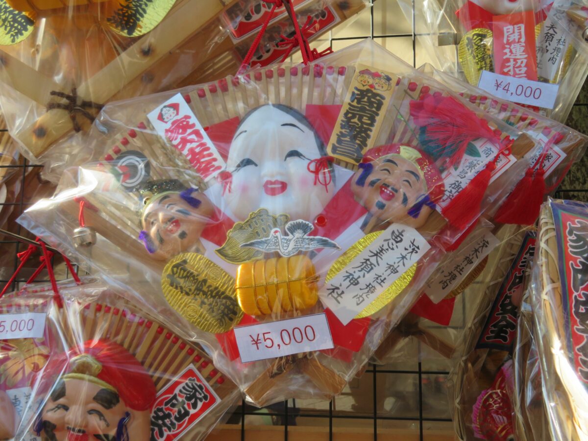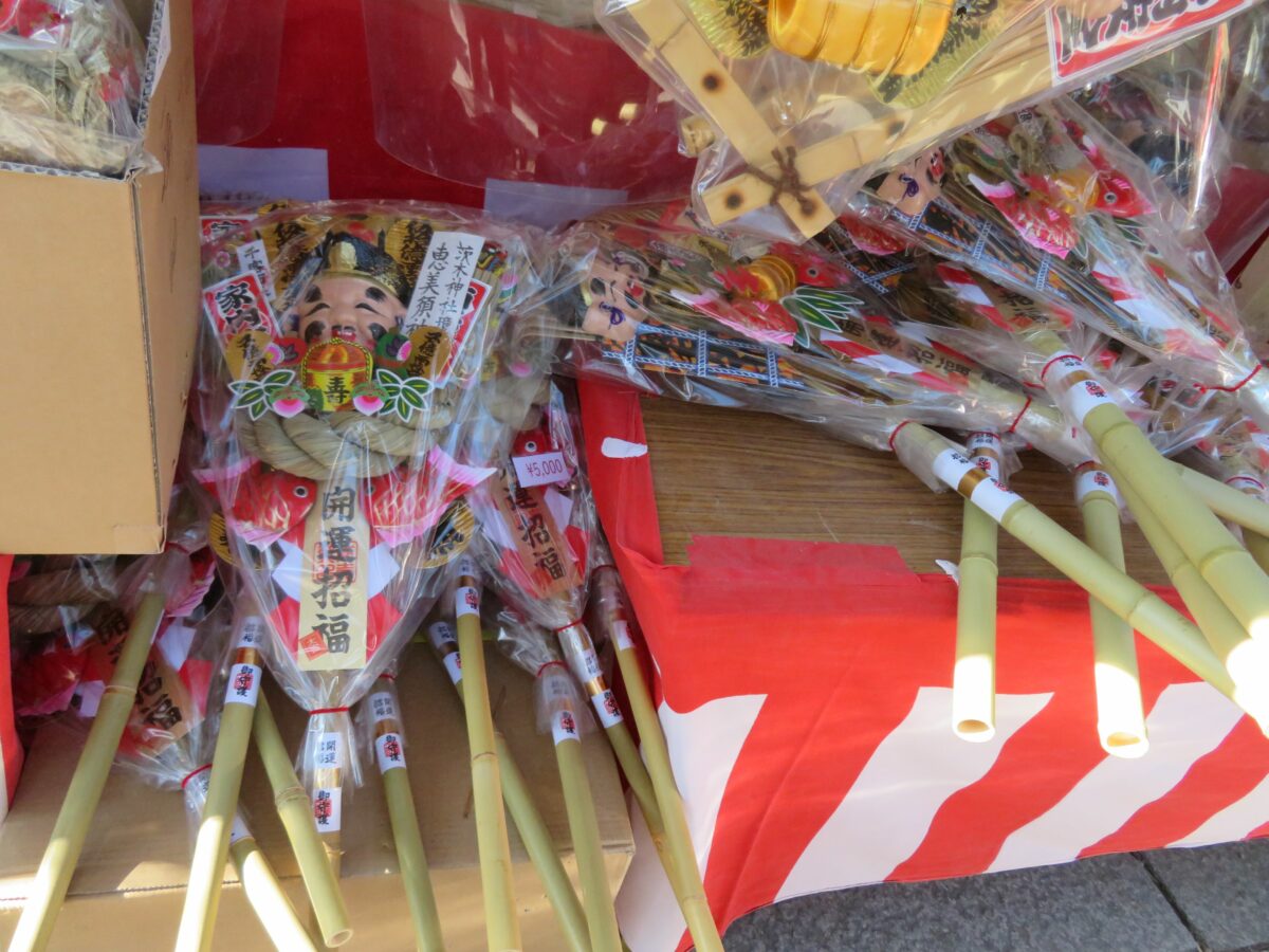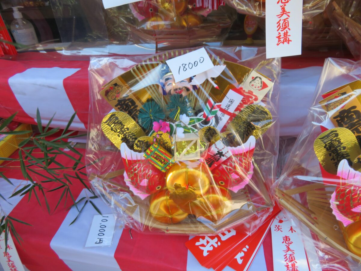 拝殿前にはマグロの他にも様々なものが奉納されますが、境内はバラエティー豊富な縁起物で溢れます。福笹をはじめ、熊手、福箕、扇、額などに恵比寿様、お多福、大判小判、鯛などがデザインされます。