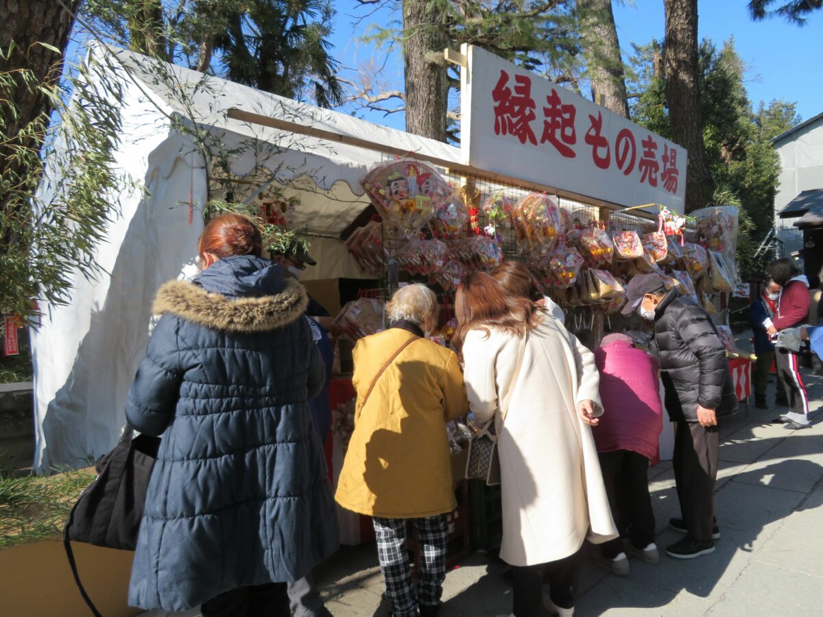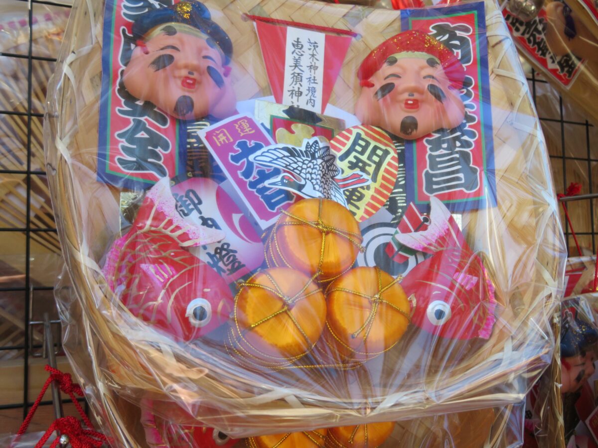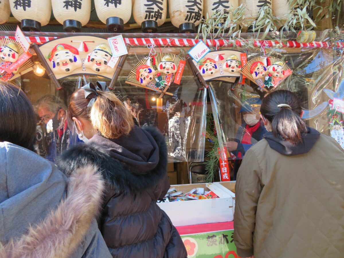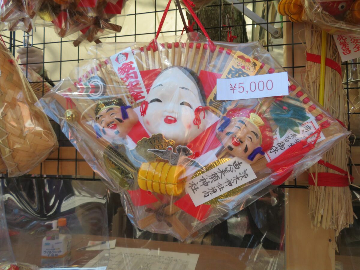 拝殿前にはマグロの他にも様々なものが奉納されますが、境内はバラエティー豊富な縁起物で溢れます。福笹をはじめ、熊手、福箕、扇、額などに恵比寿様、お多福、大判小判、鯛などがデザインされます。