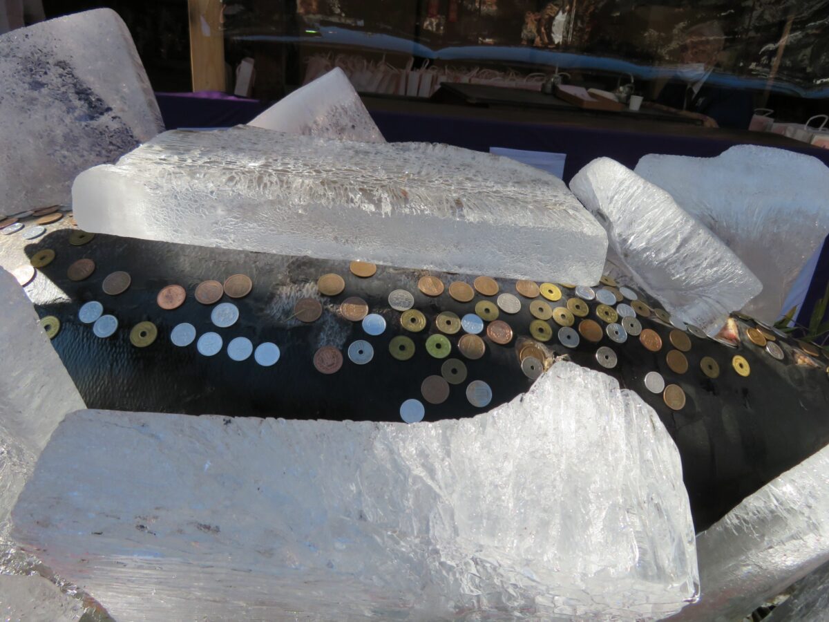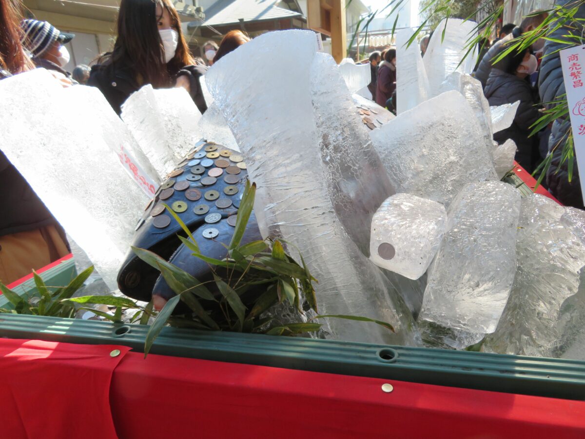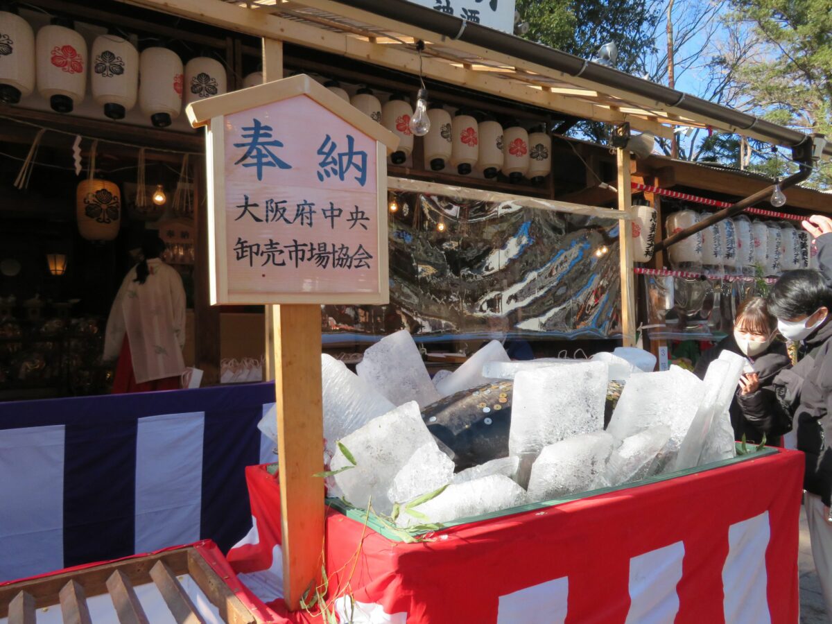 「十日戎」の3日間、茨木神社の拝殿の前には大きなマグロが奉納されます。鮮度を保つためか、氷漬けの状態です。マグロにお金を貼り付けると福を引き寄せることができると言われています。