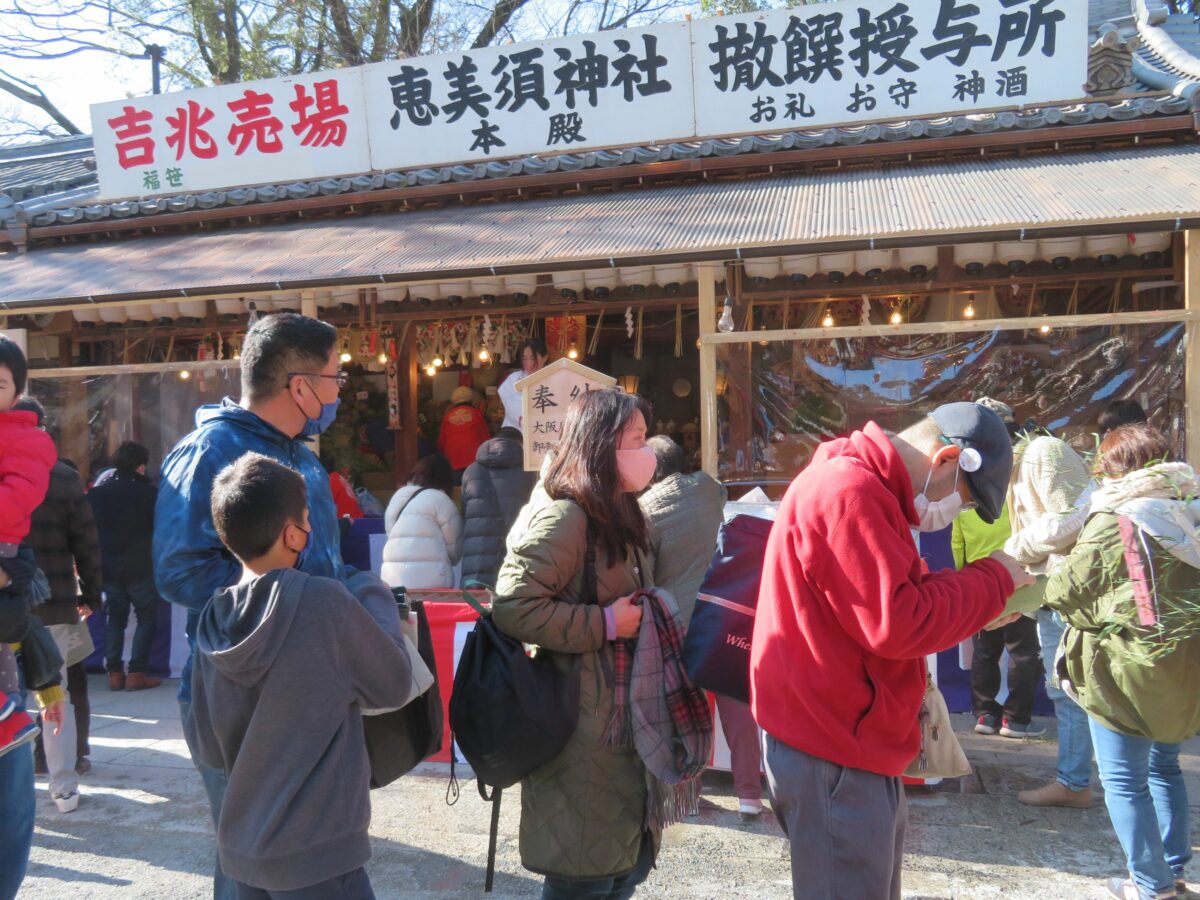 大阪府茨木市の茨木神社では、例年1月9~11日に「十日戎」が開催されています。拝殿の前には大きなマグロが奉納され、参拝者は福を願いお金を貼り付けていきます。境内にはバラエティー豊富な縁起物が溢れ、南と東の参道には露店がぎっしりと軒を連ねます。