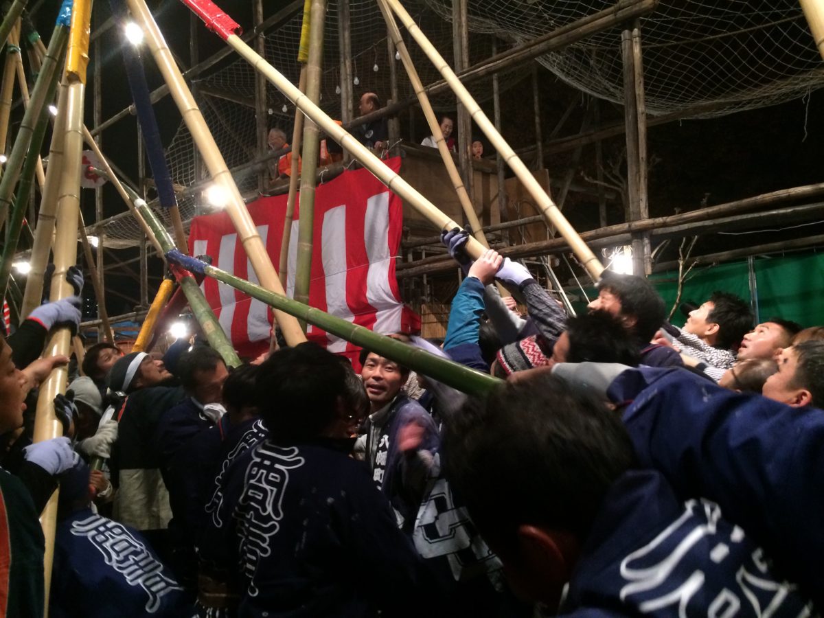 高さ約10m長さ80mにおよぶ矢来の中で、各団体が20m近い竹竿の先につけた提灯の灯を消そうと竹竿を激しく揉みし合うバトル祭。古河駅前で行われるので、奇祭にしては珍しくアクセス至便。「え? 宇都宮が近いし、栃木県じゃないの?」と思いがちかもしれませんが、古河(こが)市は茨城県の西端に位置しているのです。