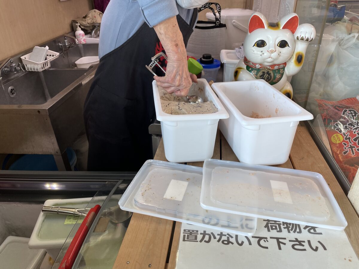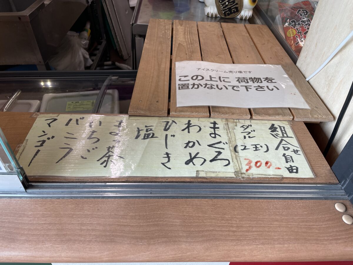 まぐろ・わかめ・ひじき?アイスクリームを注文する際には見慣れないお味が並んでおります。お値段は、ダブル(2玉)で300円(税込)。組み合わせは自由とのこと。筆者は、まぐろとひじきの組み合わせにしてみました。