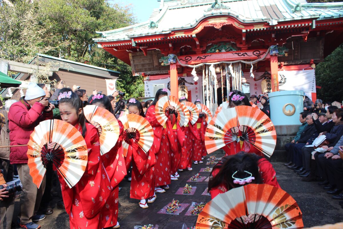 マグロの町・三崎には、「チャッキラコ」という女性のみで踊られている民俗芸能があります。毎年1月15日の小正月に大人の女性の唄に合わせて少女たちが舞扇やチャッキラコと呼ばれる綾竹を持って踊ります。この踊りは、豊漁・豊作、商売繁盛を祈願するもので、その起源は江戸時代とされています。現在では、「ちゃっきらこ保存会」により継承され、三浦の伝統文化として、少女たちが受け継いでいます。2021年の奉納は、残念ながら、新型コロナウイルス感染拡大防止のため中止されました。来年は奉納が見れることを切に願います。