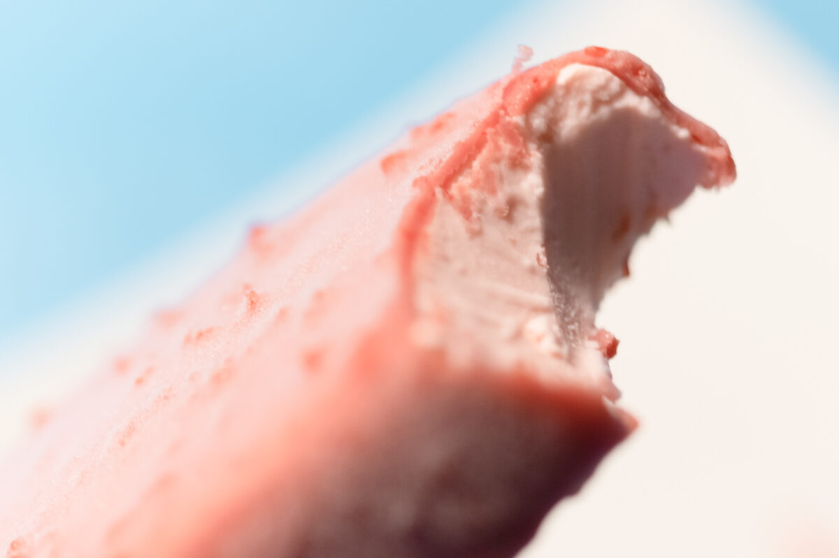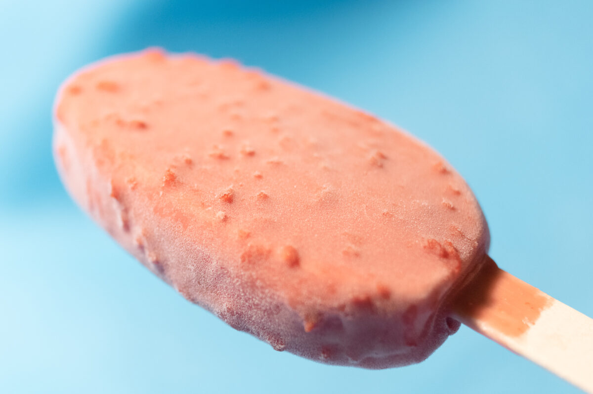 アイスの表面は、苺チョコでコーティングされています。粒々は苺のフリーズドライ。