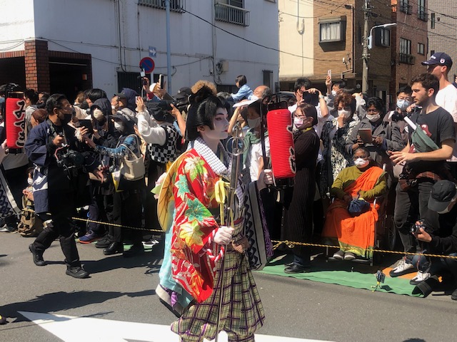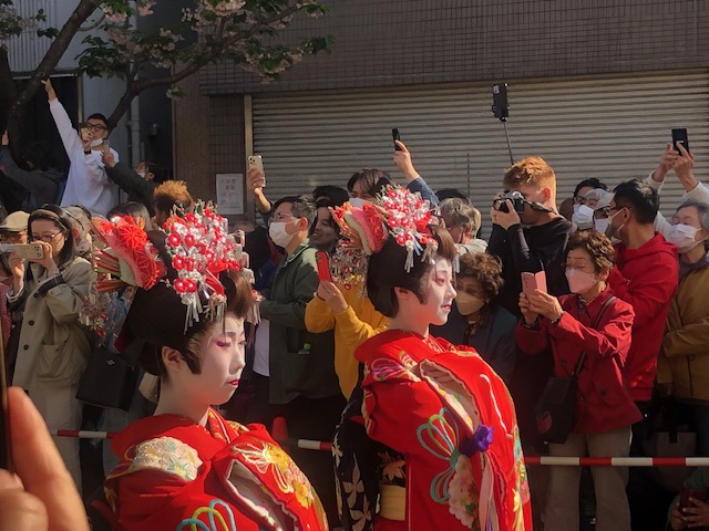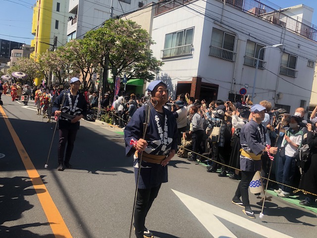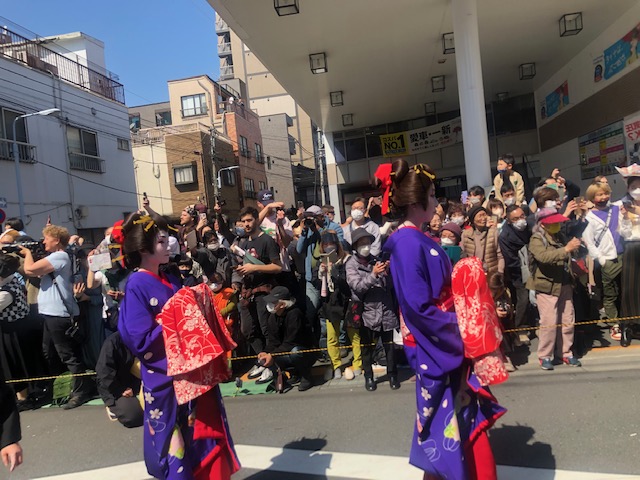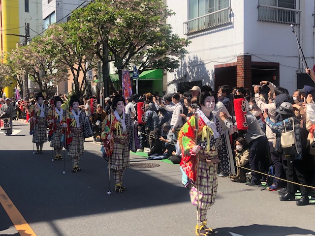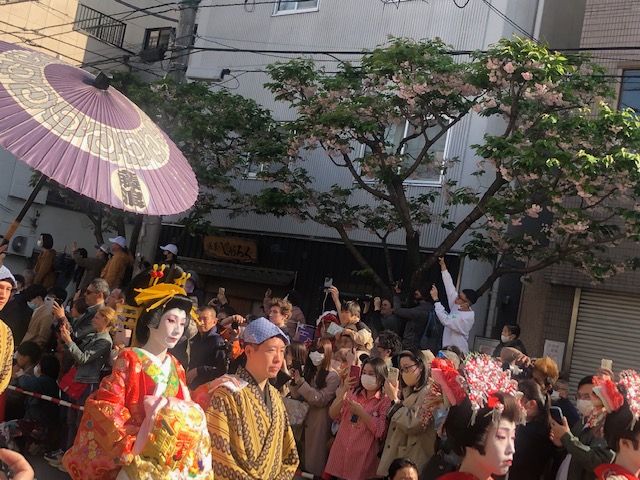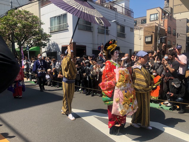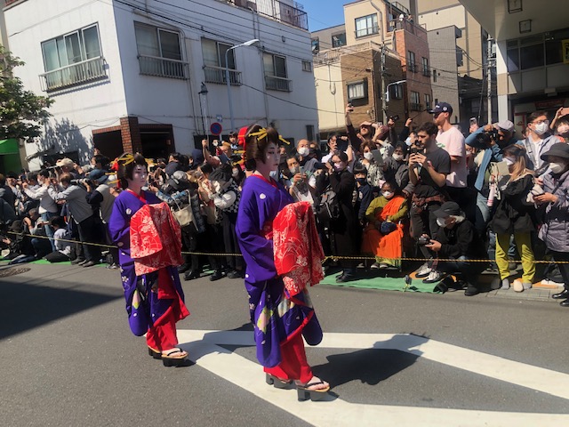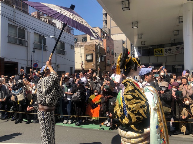 吉原の花魁文化に見る江戸の粋。背筋が伸びるような花魁の凛としたたたずまいと、そんな花魁に異世界の美を見てあこがれる江戸の人々、そんな情景を再現してくれる一葉桜まつりの花魁道中。八重桜の淡い桃色の花びらが舞い散る晴天の中で行われるこの絵巻物のような祭りをなんとしても開催したいという実行委員の皆様の熱く強い思いも感じられました。警備にあたる地元の方もとてもうれしそうな様子でした。