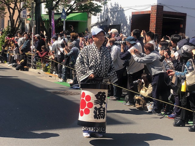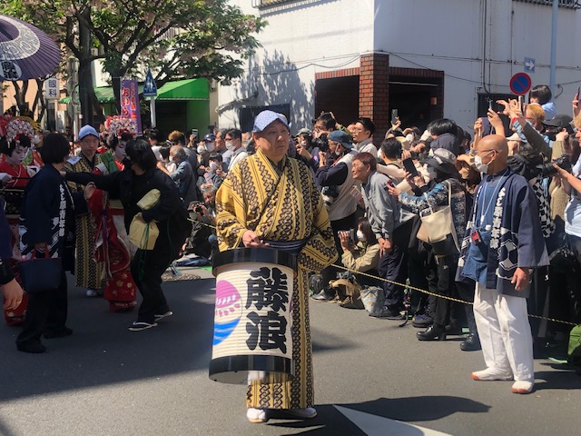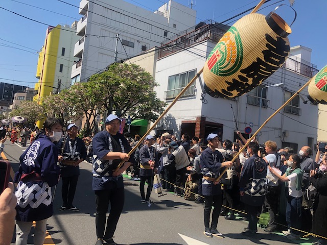 まずは、吉原神社の名の入った高張提灯が先導。長く、大きな立派な提灯、晴天に映えます。