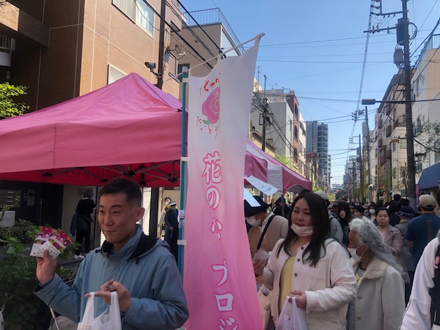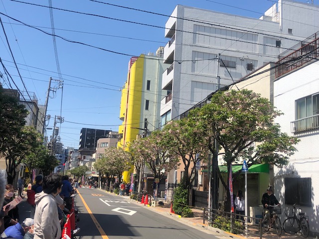 しばし歩いて千束通りから、一葉桜・小松橋通りへ。通行止めされた八重桜の美しい通りでは、片側に赤いポールが置かれ、関係者の方がチラシを配布しています。