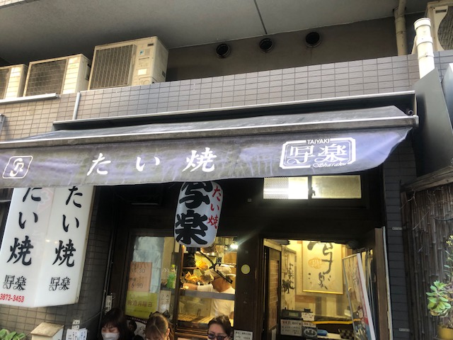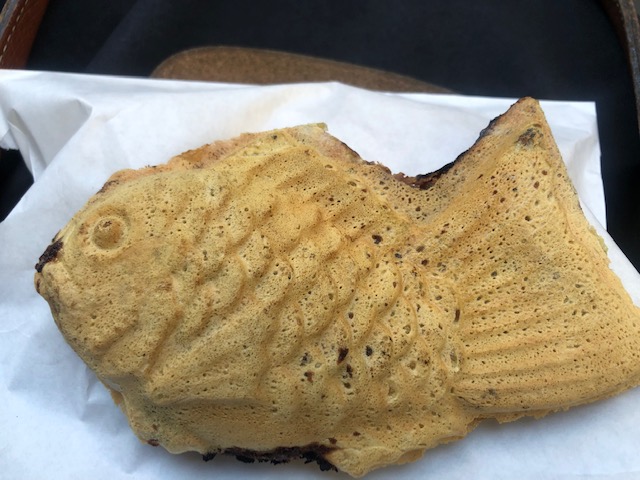 こちらは写楽と言うたい焼き屋さん。頼んで十分ほどベンチで待つと、熱々のたい焼きが運ばれてきます。