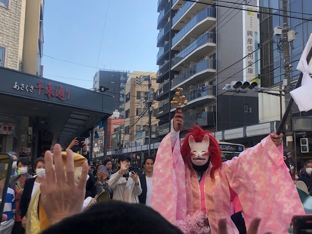 ステージ上、まずは吉原の狐舞。人が多くてほとんど見えない状況ですが、コミカルな動きとみんなに幸をふるまう軽妙なトークが伝わってきます。