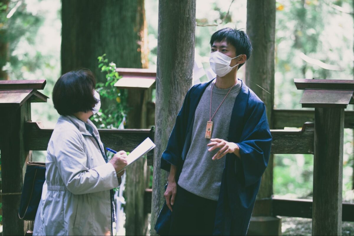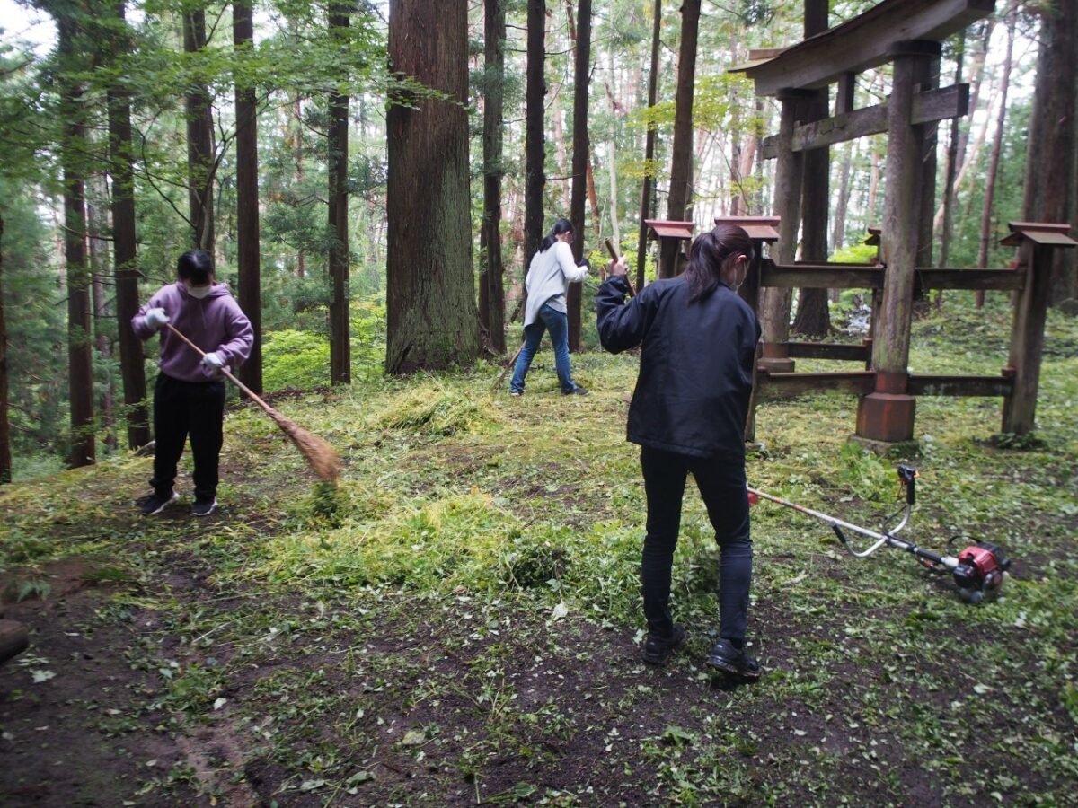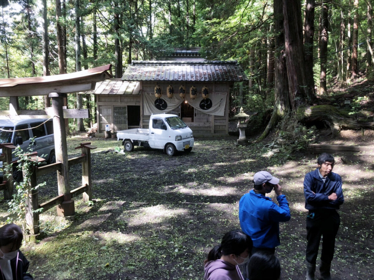 地元の方々をはじめ、新聞社3社の記者さん、町長、かつての住民などが続々と集まりました。境内の入り口では学生ボランティアが検温とアルコール消毒を呼びかけ、感染症対策も万全。緊張感が高まっていきます。
